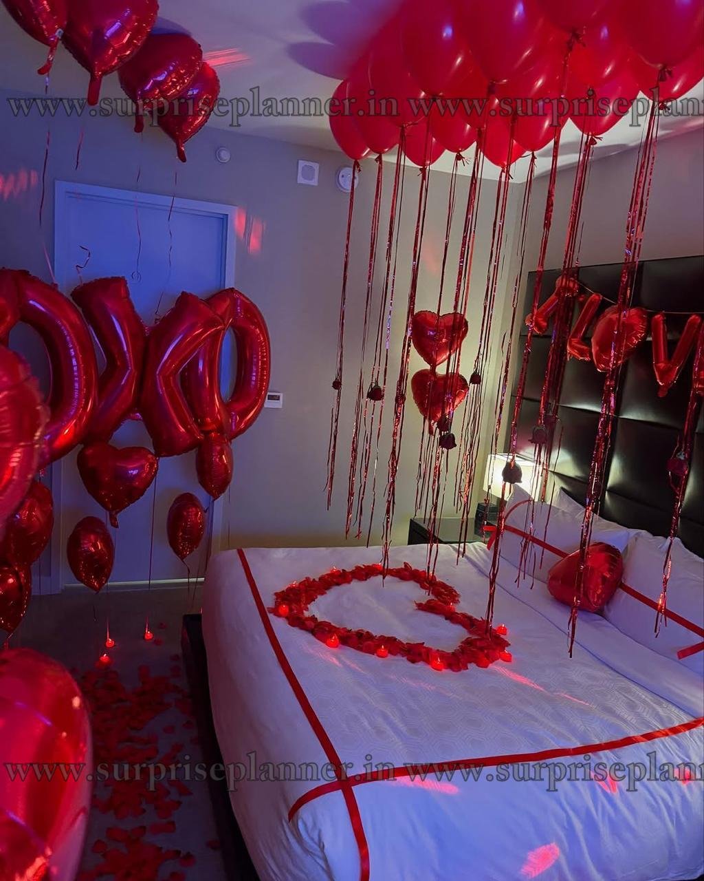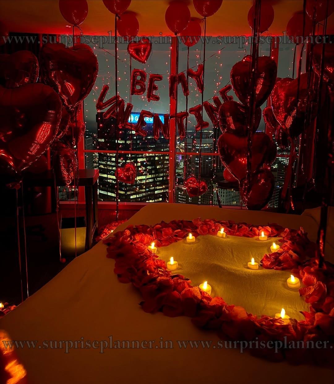 This enchanting Valentine’s Day room decoration is the perfect setting for a romantic surprise. The dimly lit ambiance is accentuated by warm candlelight and a breathtaking city view, making the moment truly magical. The bed is adorned with a heart-shaped arrangement of red rose petals, surrounded by glowing candles, adding an intimate and passionate touch.
