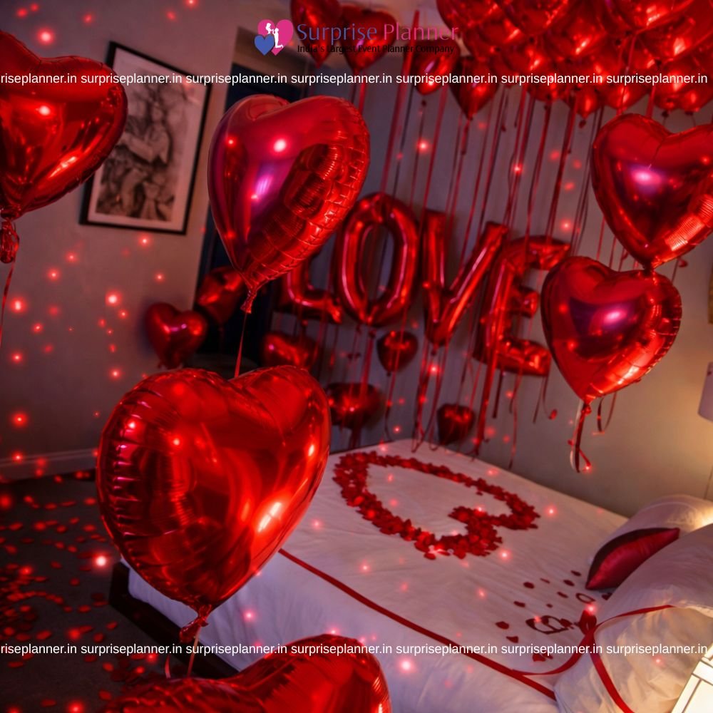 The backdrop features floating red heart-shaped balloons and a "BE MY VALENTINE" balloon banner, creating a visually stunning declaration of love. Twinkling fairy lights add a dreamy charm, making the atmosphere even more romantic.