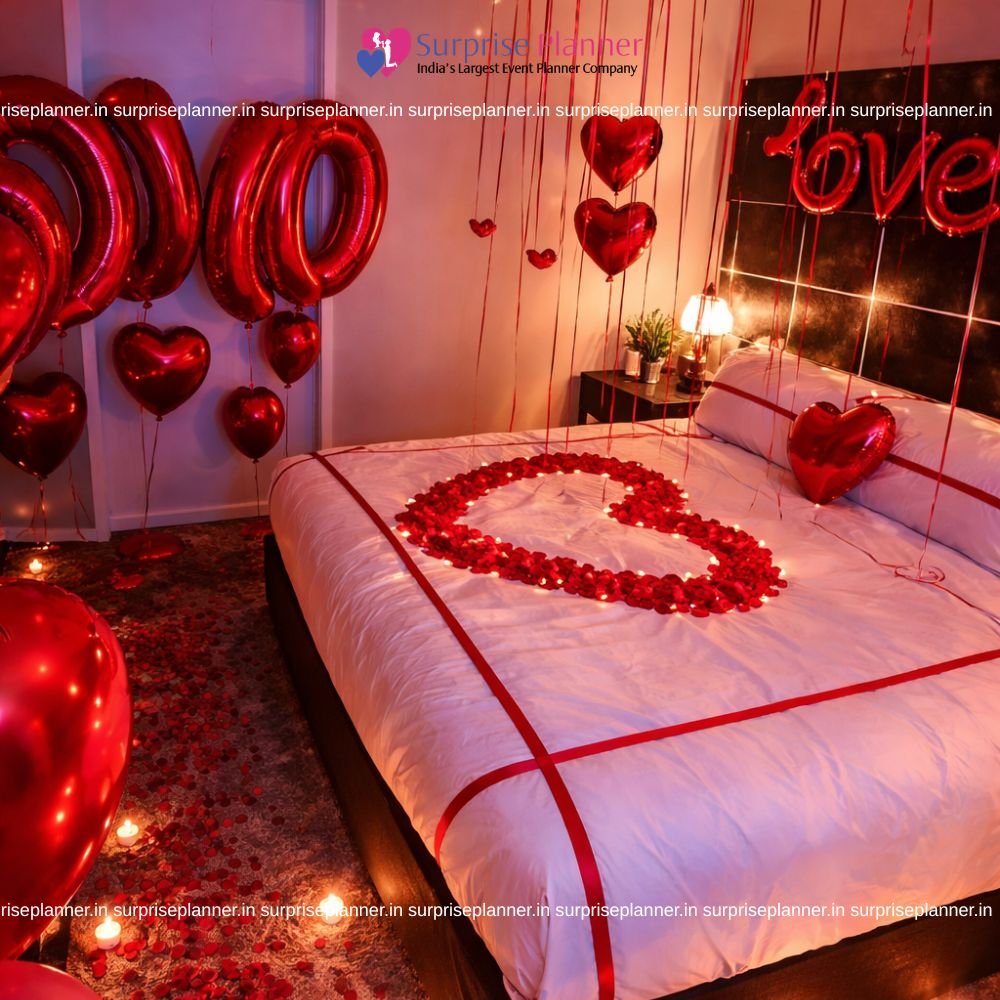 This enchanting Valentine’s Day room decoration is the perfect setting for a romantic surprise. The dimly lit ambiance is accentuated by warm candlelight and a breathtaking city view, making the moment truly magical. The bed is adorned with a heart-shaped arrangement of red rose petals, surrounded by glowing candles, adding an intimate and passionate touch.