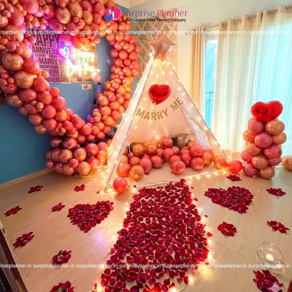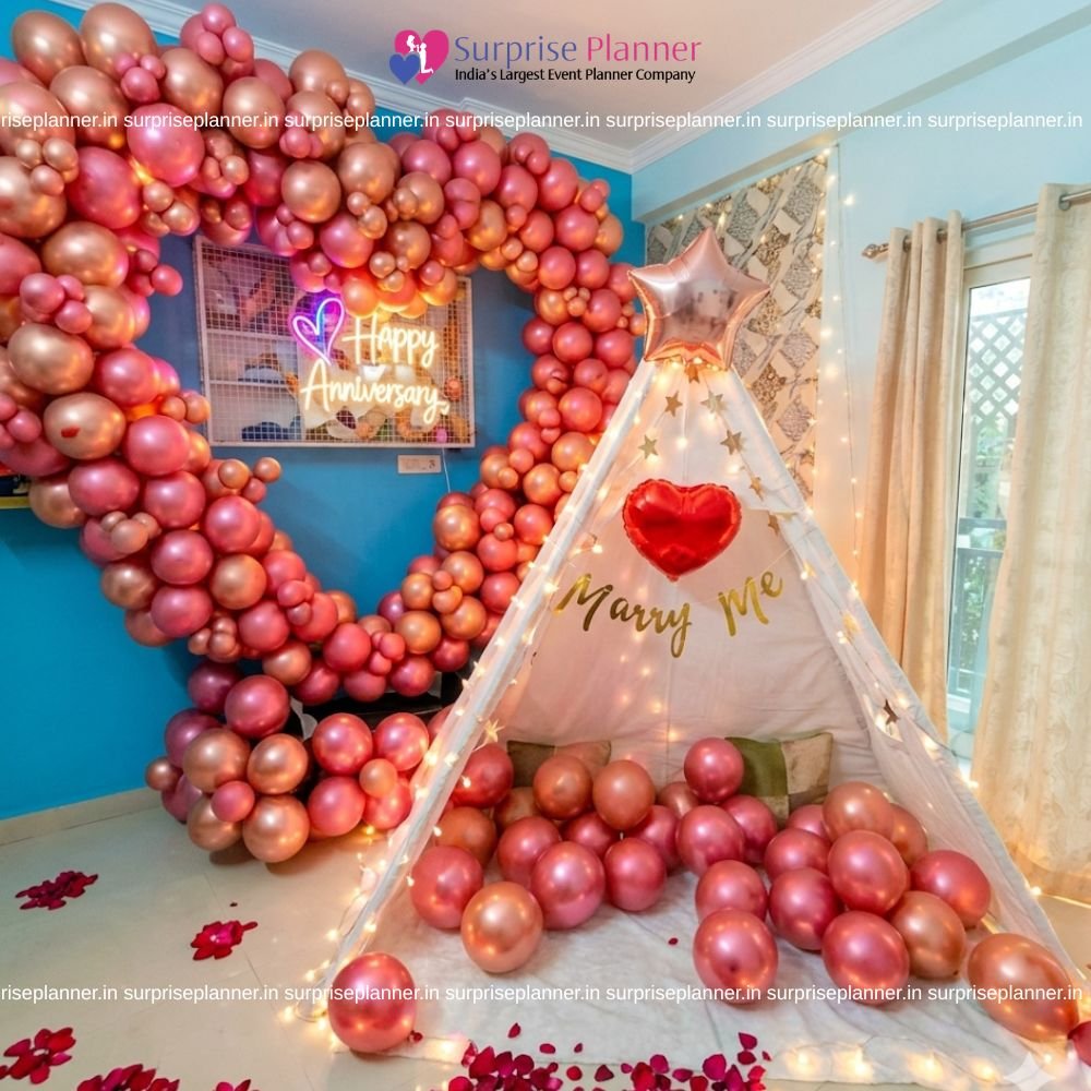 Our Premium Heart & Canopy Setup will transform your home into a romantic paradise. These elegant decorations include a canopy design combined with soft, flowing materials and stunning fairy lights, creating an intimate and elegant atmosphere and a beautiful heart-shaped balloon arrangement is red, pink and gold in the middle add a touch of romance and luxury. This set is ideal for celebrations, proposals, or special date evenings, and can be customized, for a special touch. Our skilled decorators handle everything from floral accents to ambient lighting to provide a spectacular and unforgettable event. Celebrate love in style with these stunning heart and canopy decorations.