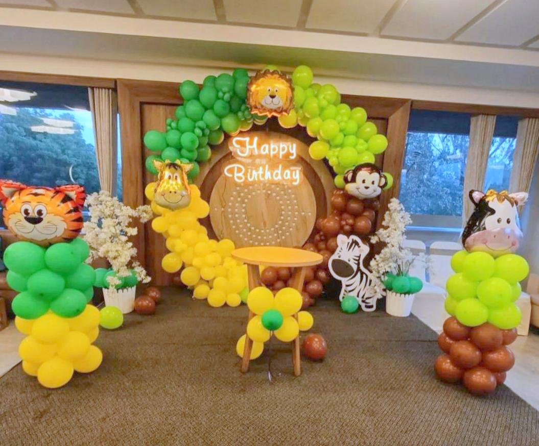 Turn your child's birthday into a wild experience with our animal themed birthday ring decor. This stunning arrangement includes a wide circular balloon with jungle themed balloons in a color mix of green, yellow, blue and orange Accented with fascinating animal cutouts like lions, elephants, monkeys and giraffes, this décor this brings the safari into your celebration . It’s ideal for a happy and lively mood and doubles as an eye-catching photo backdrop and interior. Ideal for both indoor and outdoor celebrations, our professional decorators customize the design to suit your needs, ensuring a personal touch. Make your child's birthday even more special with this colorful and dynamic animal themed decor.