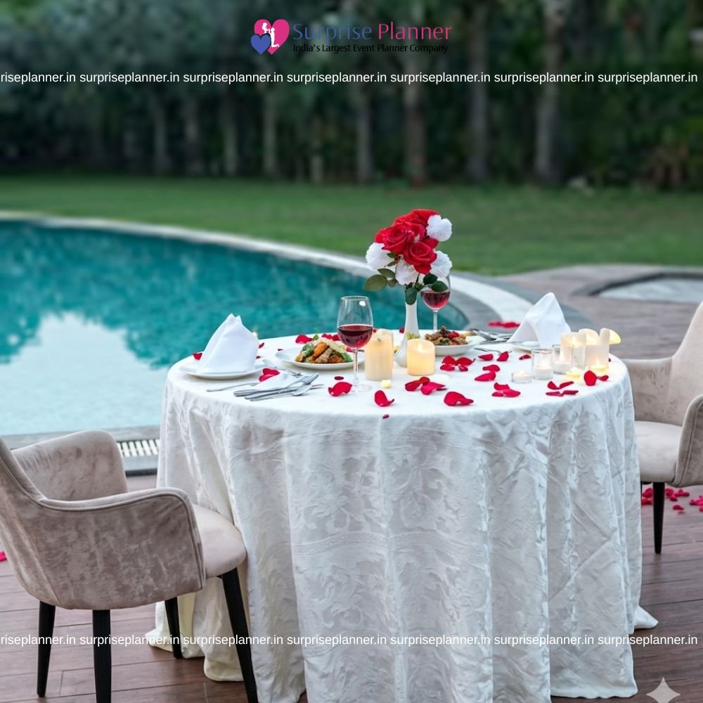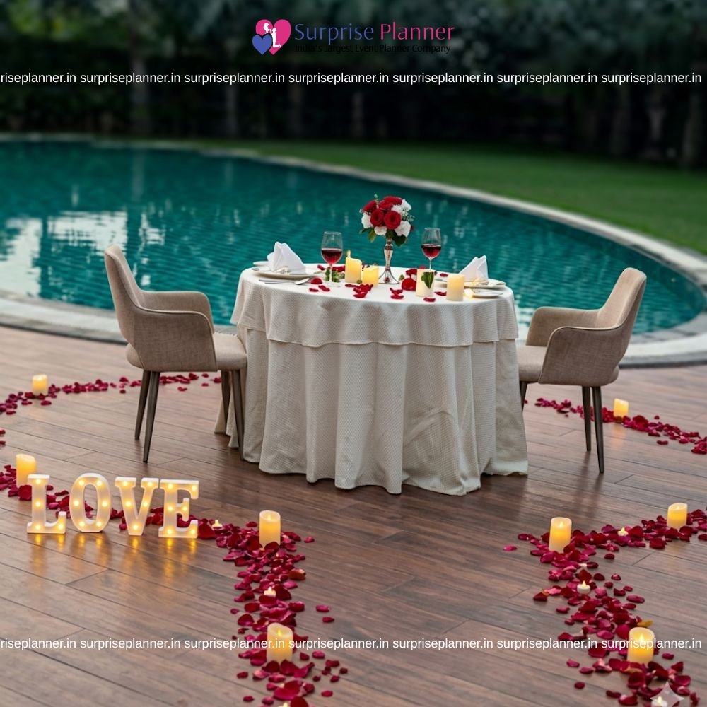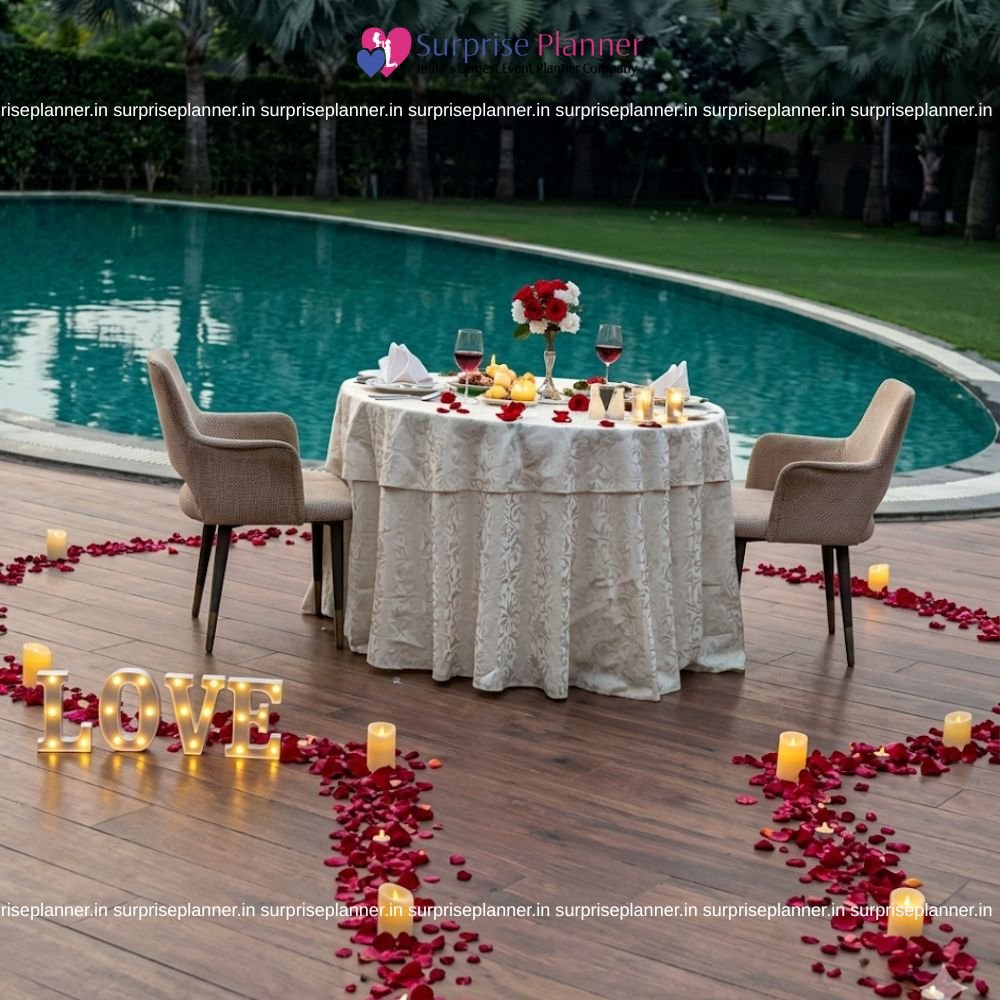 As shown in the reference, a beautifully decorated table is set right beside a glowing pool, surrounded by soft ambient lighting. The setup features a stylish table arrangement with candles, rose petals, and elegant décor that reflects beautifully on the water, creating a mesmerizing romantic atmosphere. The gentle lighting and peaceful surroundings make it an ideal spot for an intimate evening.