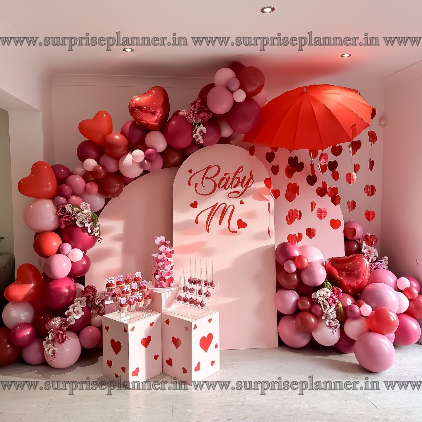 Celebrate love in the most charming way with our “Baby M” Valentine’s Day Love Arch Decoration Setup, designed to create a dreamy, romantic, and picture-perfect surprise. This setup features a luxurious organic balloon arch in shades of red, blush pink, and rose, beautifully styled with heart-shaped foil balloons, artificial floral accents, and a unique hanging heart umbrella décor.