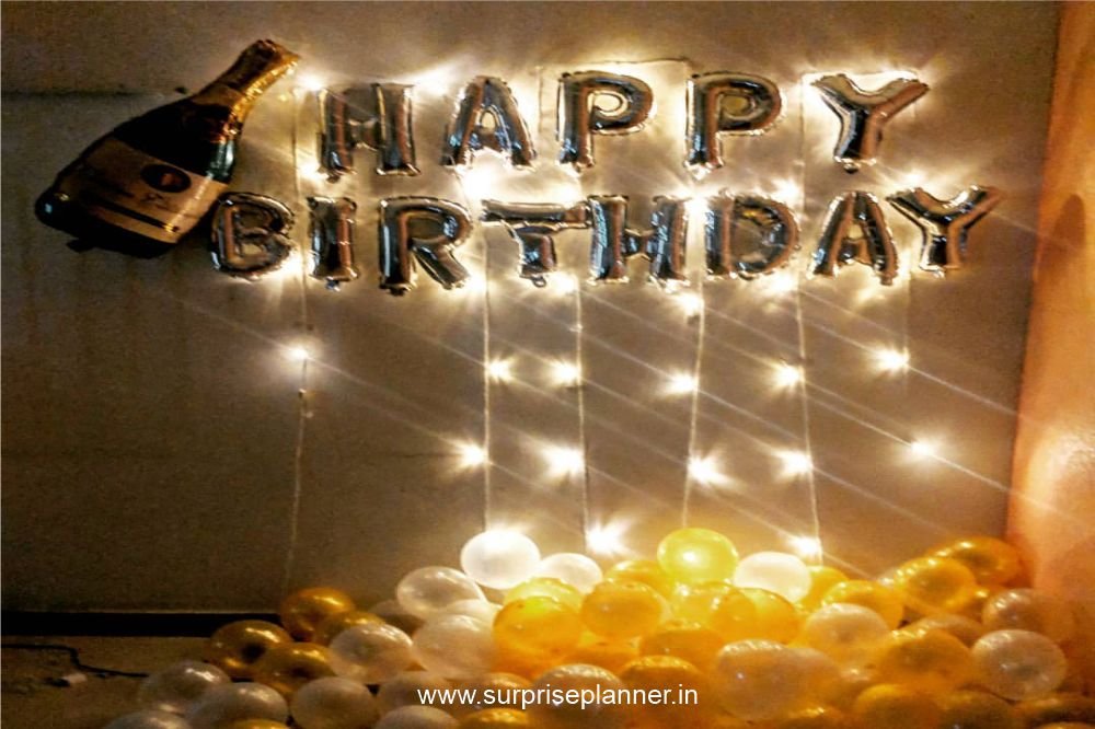 Birthday/Anniversary Surprise in Jaipur. Birthdays and balloons go together, and if youre planning to throw a party for someone, here is the perfect balloon decor you could think of! This balloon decor consists of birthday balloons, LED lights and champagne glasses/whiskey bottle balloon. Charm someone with a grand surprise on their birthday. This beautiful balloon decor is perfect to astonish a friend while throwing a zestful party. With fun-filled balloons all around, make the day joyful.
