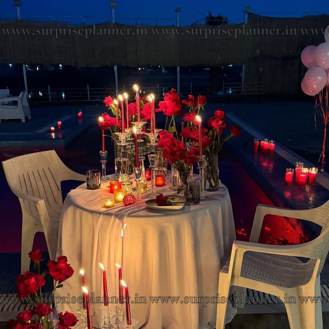 Create unforgettable memories with this romantic candlelight setup. Surrounded by the serene glow of 20 of candles and scattered red rose petals, the intimate ambiance is perfect for a proposal, anniversary, or special date night. A beautifully decorated round table, adorned with elegant floral arrangements and soft lighting, sits at the center of the setup. The dining setup enhances the magical atmosphere, reflecting the flicker of the candles. White chairs and a bunch of white balloons complete the cozy yet luxurious scene. This stunning arrangement offers a dreamy backdrop for heartfelt moments and cherished celebrations, making it an ideal choice for couples seeking an unforgettable evening.