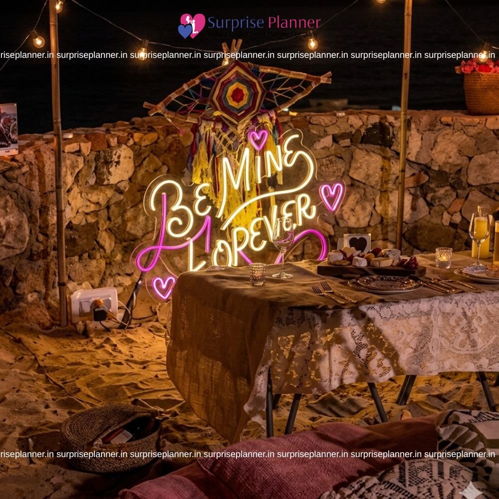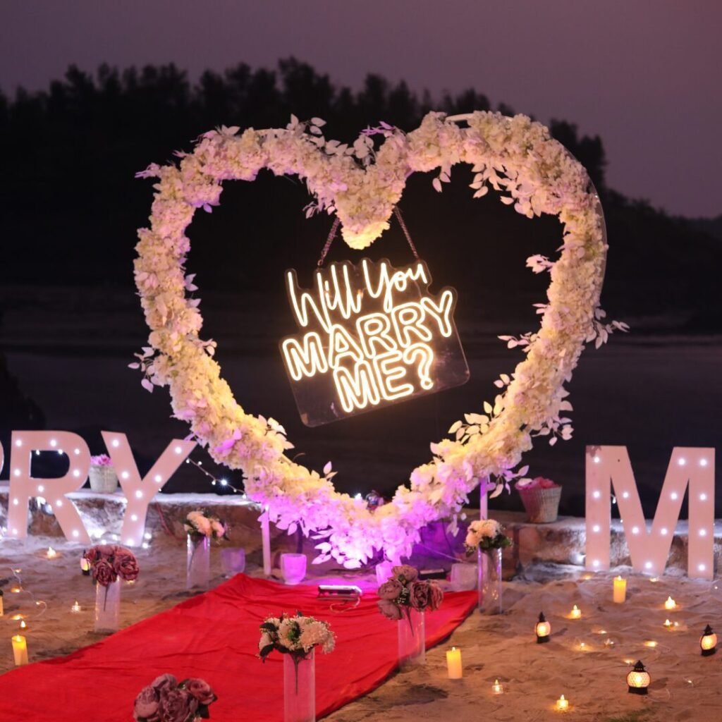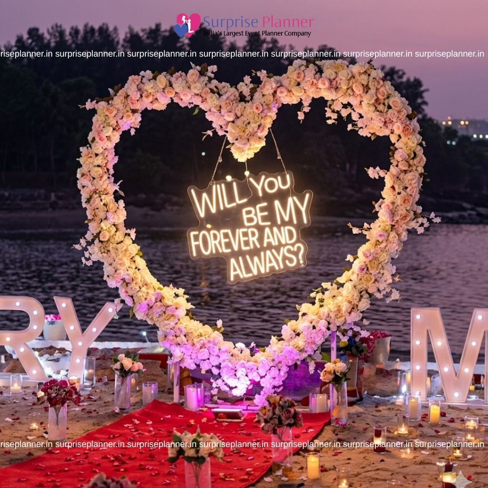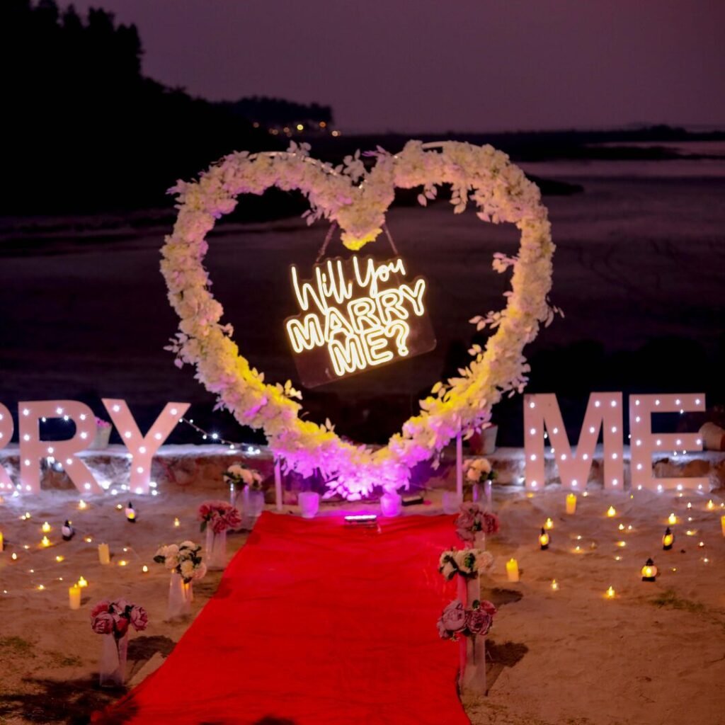 Embrace the enchantment of a beachside proposal with 'White Twilight Beach Proposal,' where pristine white florals and soft candlelight set the stage for romance. This private oasis features a magnificent white floral heart as its centerpiece, backlit by the luminous 'Marry Me' LED sign. Located at a secluded sundowner spot, it's the perfect setting for an intimate dinner date, away from the world. Pledge your love by the rhythmic sea, and let 'White Twilight' be the beginning of your forever.