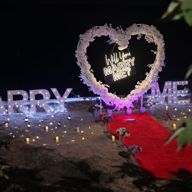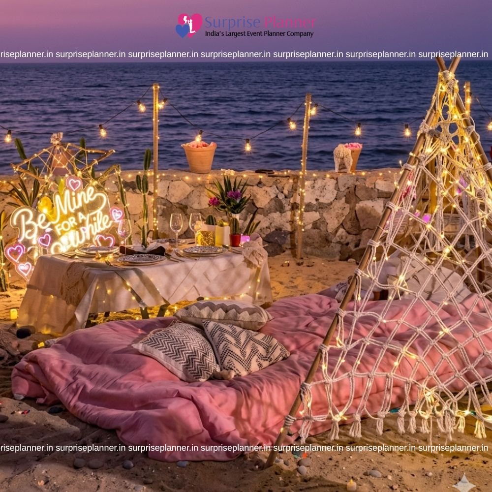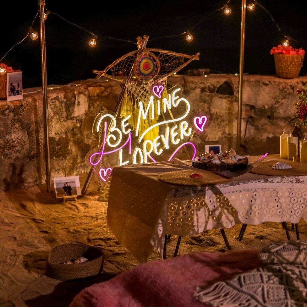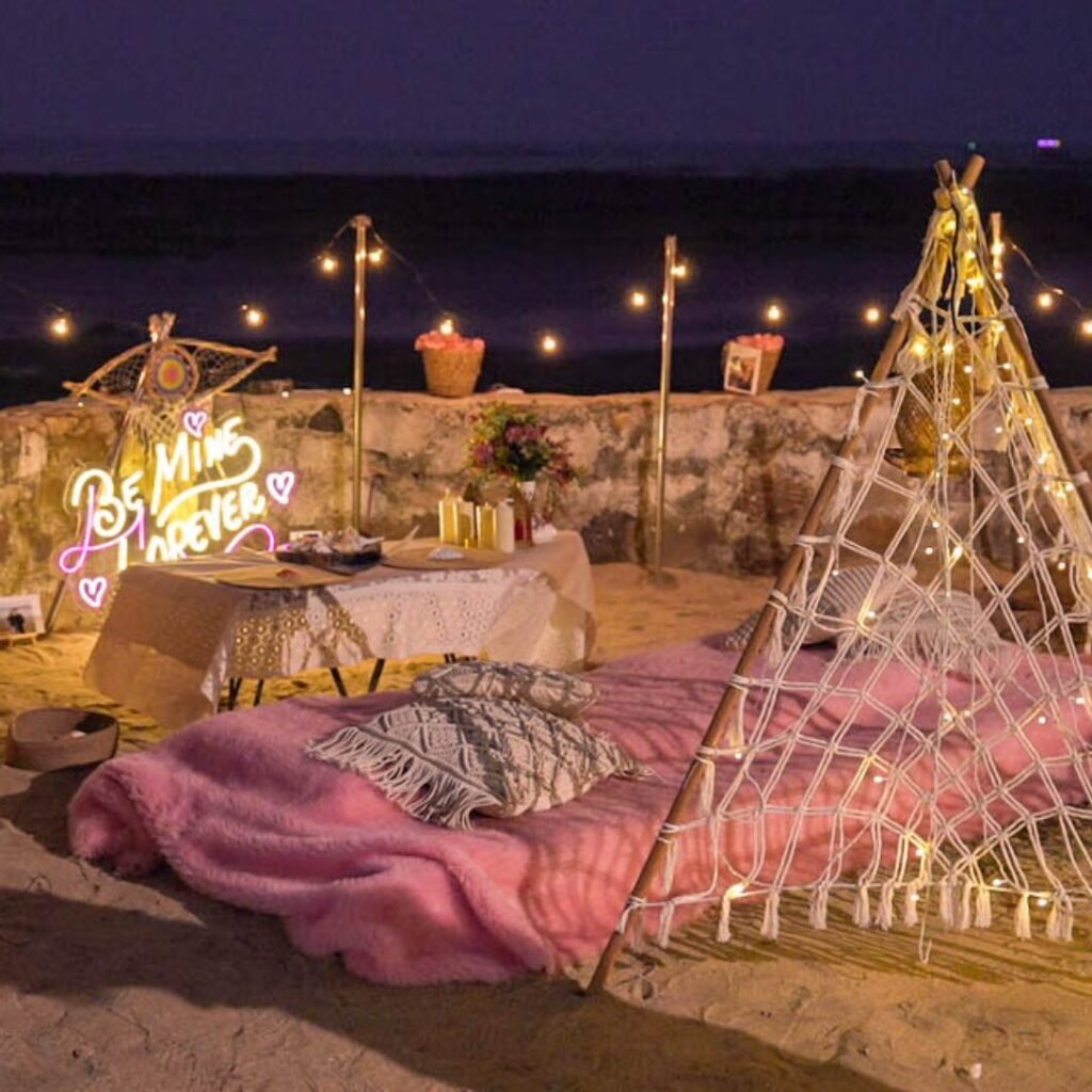 Embrace the enchantment of a beachside proposal with 'White Twilight Beach Proposal,' where pristine white florals and soft candlelight set the stage for romance. This private oasis features a magnificent white floral heart as its centerpiece, backlit by the luminous 'Marry Me' LED sign. Located at a secluded sundowner spot, it's the perfect setting for an intimate dinner date, away from the world. Pledge your love by the rhythmic sea, and let 'White Twilight' be the beginning of your forever.