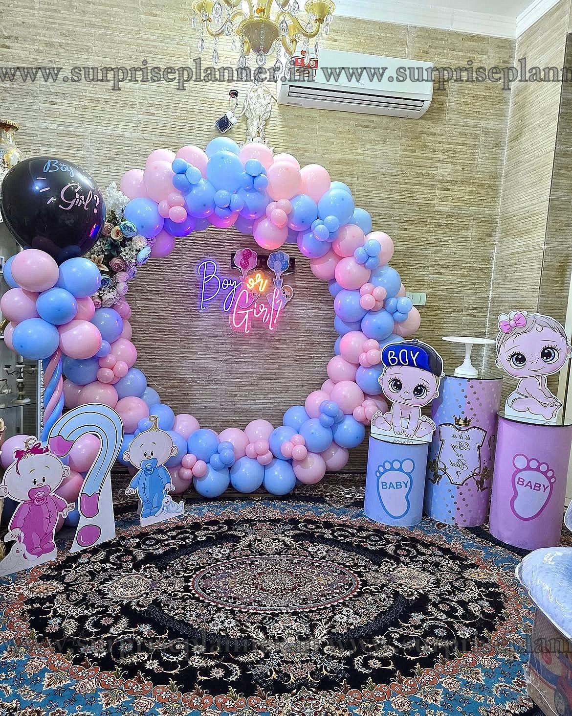 Adorning the setup are charming cutouts of babies dressed in blue and pink outfits, surrounded by matching themed props. Two cylindrical stands on the right display adorable baby figures and footprints labeled "BABY," enhancing the celebratory atmosphere. A large black balloon also teases the big reveal, typically popped to disclose the baby's gender.