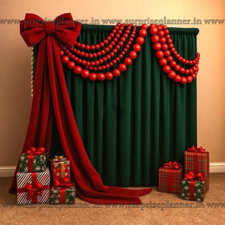 Bring timeless Christmas charm to your celebration with our Classic Green & Red Christmas Backdrop Decoration. This setup features a rich deep green pleated backdrop, beautifully accented with luxurious red fabric draping styled into an oversized festive bow.