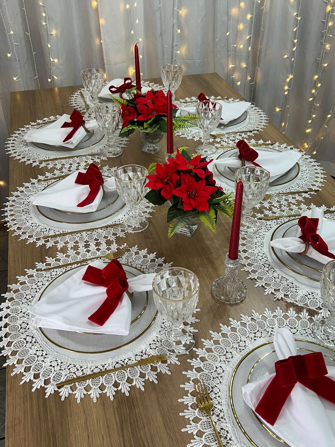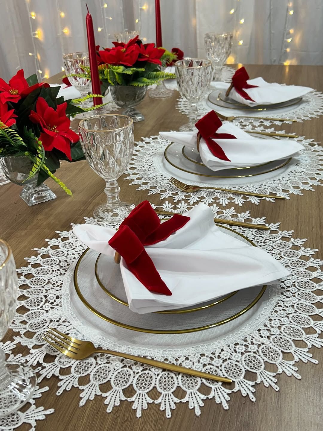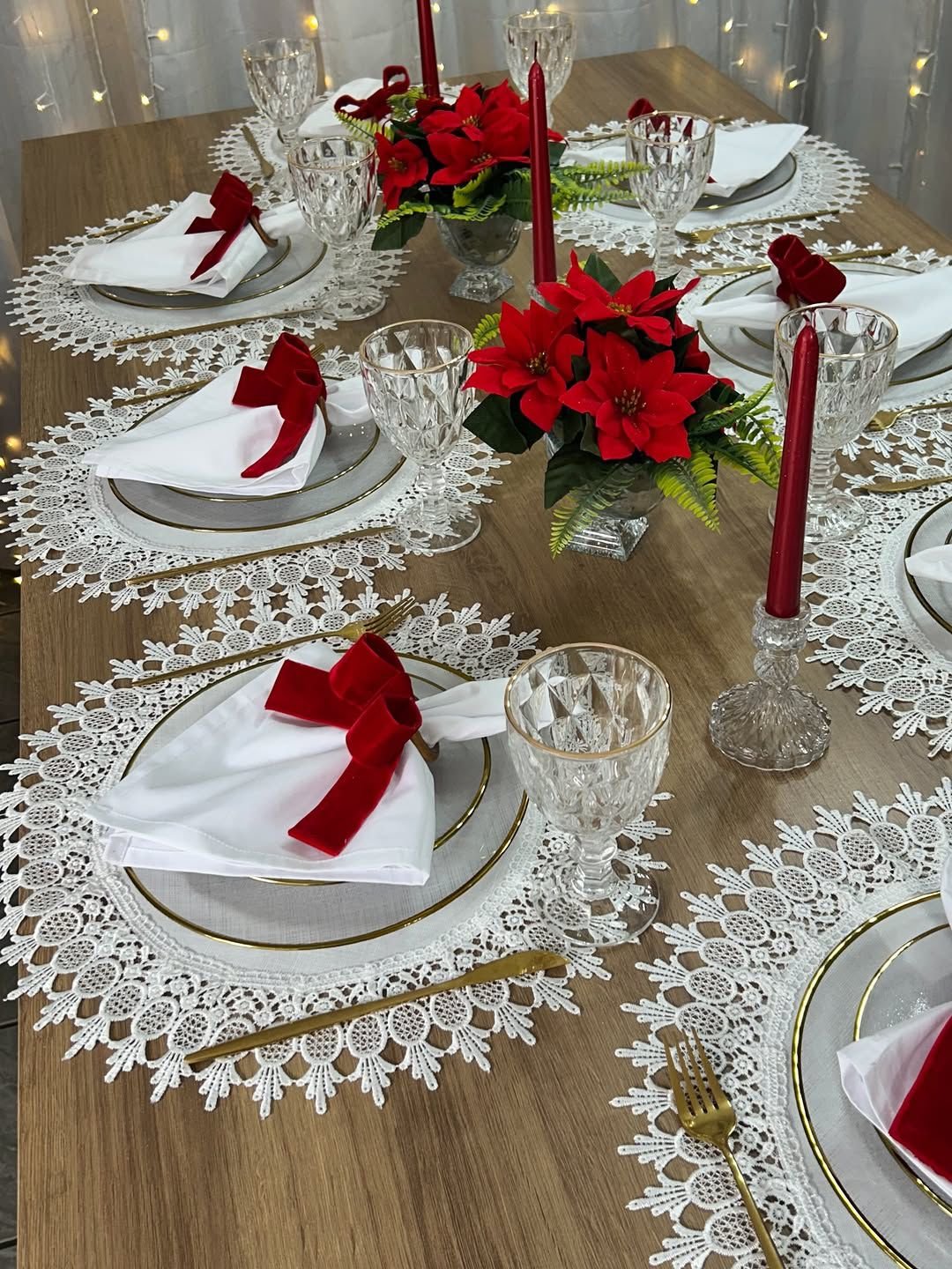 The dining table is styled with delicate lace placemats, white crockery with gold rims, crystal-finish glassware, and neatly folded white napkins finished with elegant red bows. The centerpiece features festive red poinsettia floral arrangements paired with tall red candles, creating a warm, intimate, and festive glow. Soft fairy lights in the backdrop enhance the ambiance, making it perfect for Christmas Eve dinners, family gatherings, and sophisticated holiday celebrations at home or in private venues.