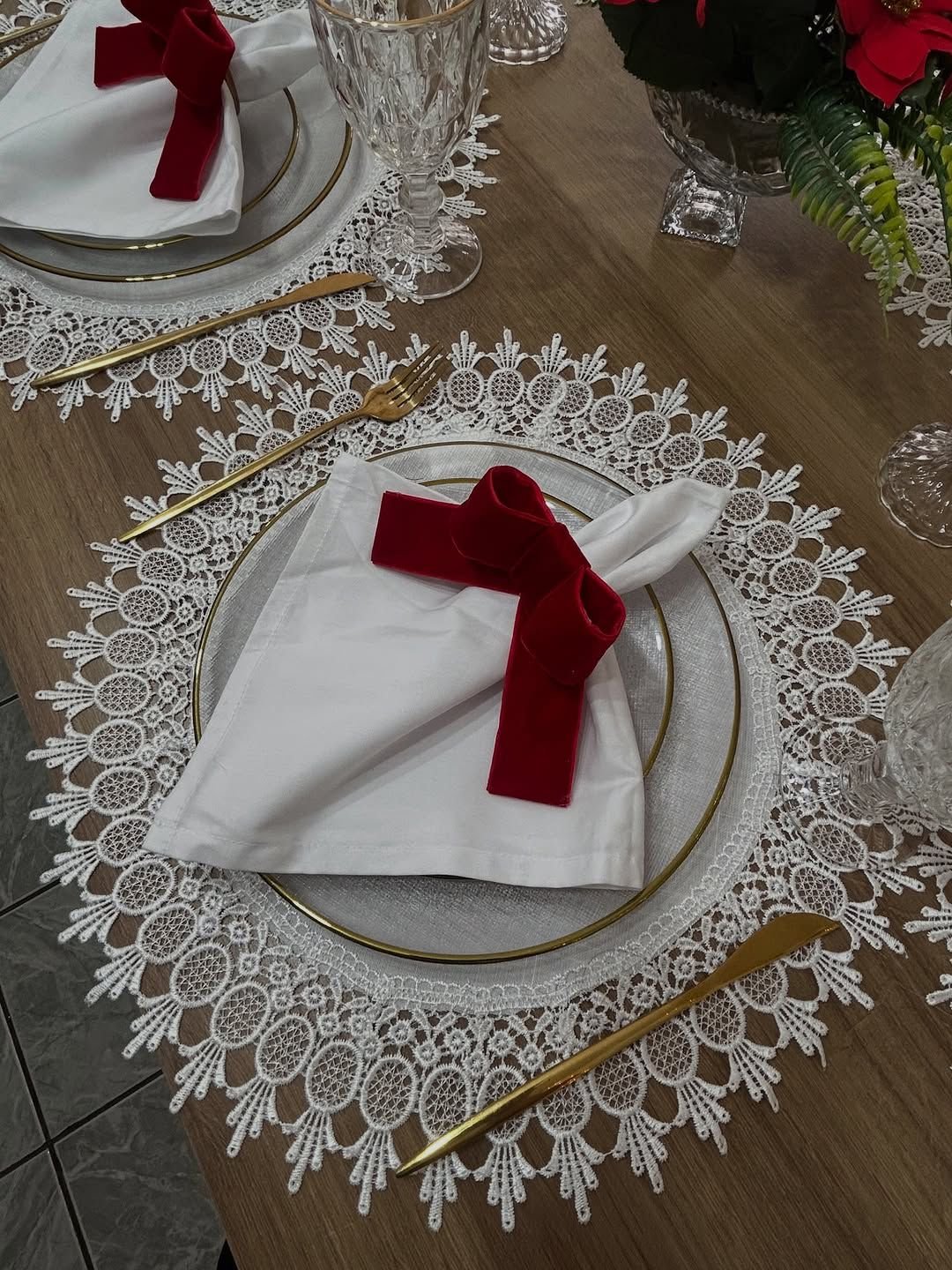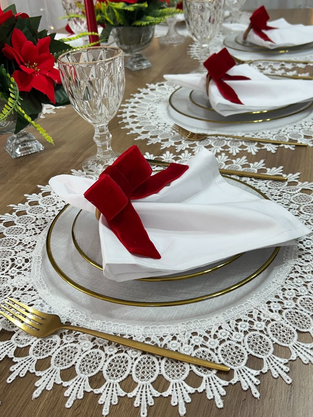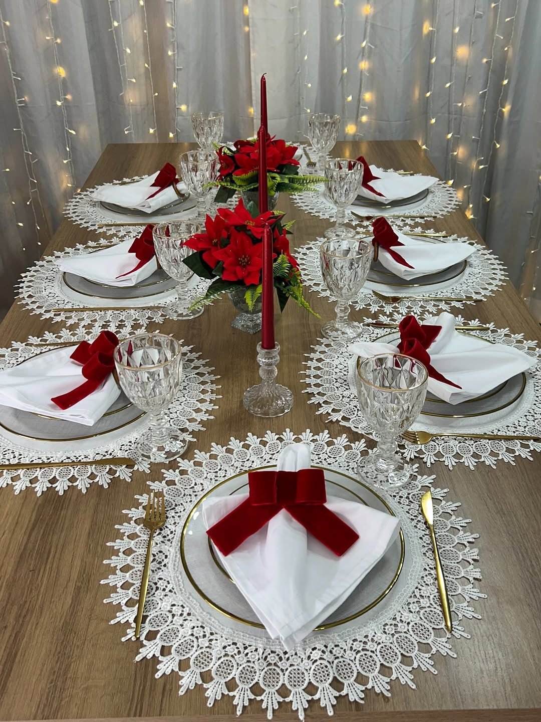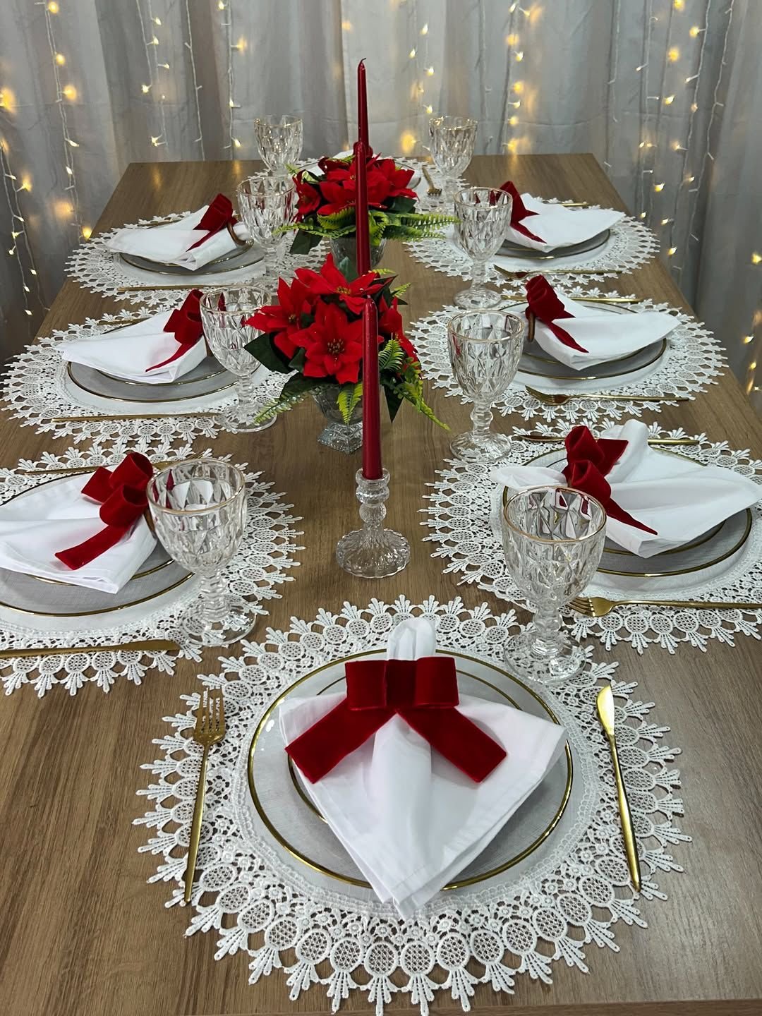 The dining table is styled with delicate lace placemats, white crockery with gold rims, crystal-finish glassware, and neatly folded white napkins finished with elegant red bows. The centerpiece features festive red poinsettia floral arrangements paired with tall red candles, creating a warm, intimate, and festive glow. Soft fairy lights in the backdrop enhance the ambiance, making it perfect for Christmas Eve dinners, family gatherings, and sophisticated holiday celebrations at home or in private venues.