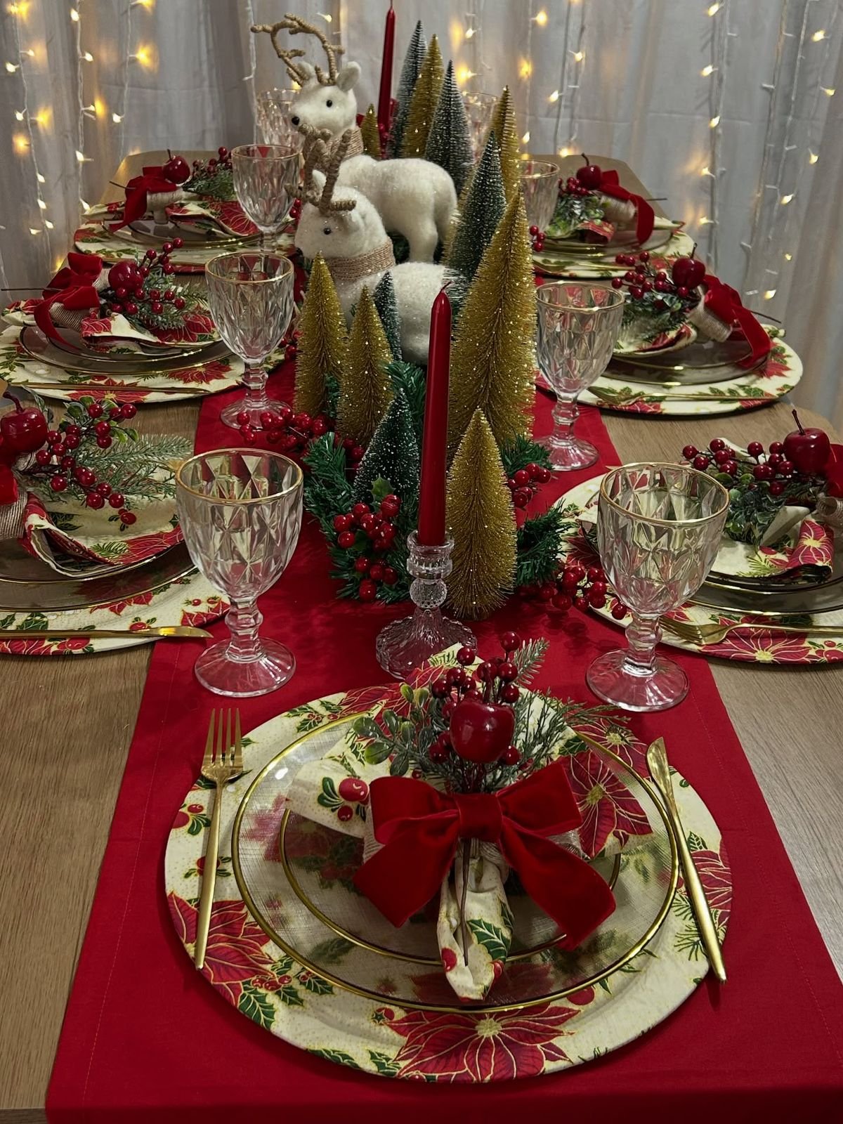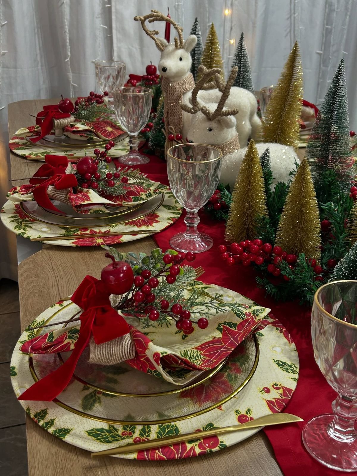 The table features a deep red runner layered with premium Christmas-themed plates and napkins adorned with poinsettia and holly prints. Gold-rimmed dinnerware, crystal-style glassware, and gold-finish cutlery elevate the look, while the centerpiece steals the spotlight—featuring charming white reindeer figurines surrounded by mini Christmas trees, pine greenery, red berries, and festive ornaments. Soft fairy lights in the backdrop enhance the cozy, joyful Christmas vibe.