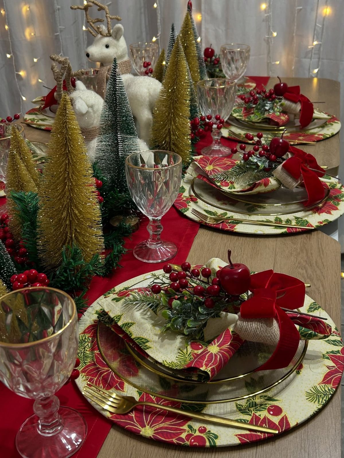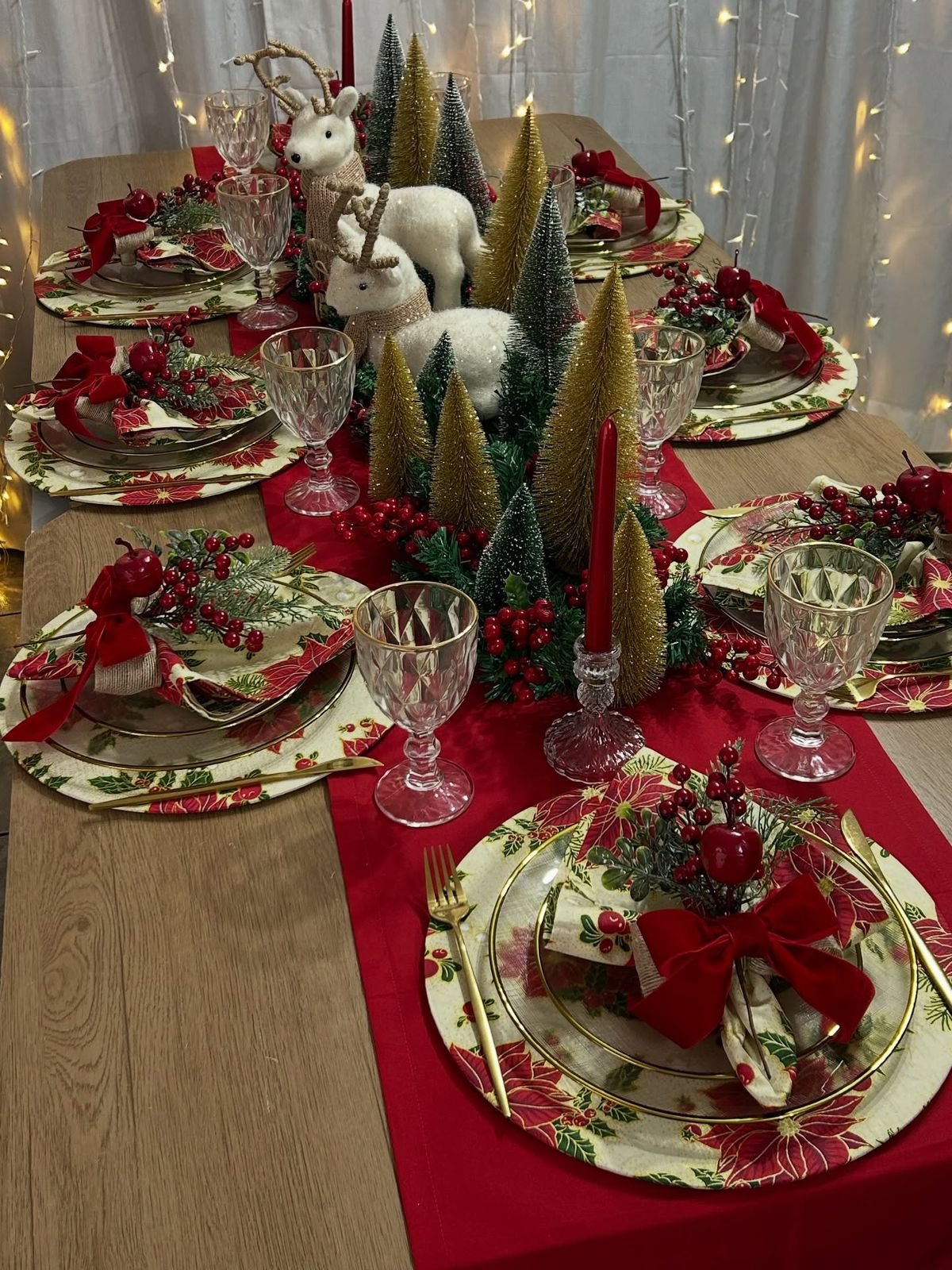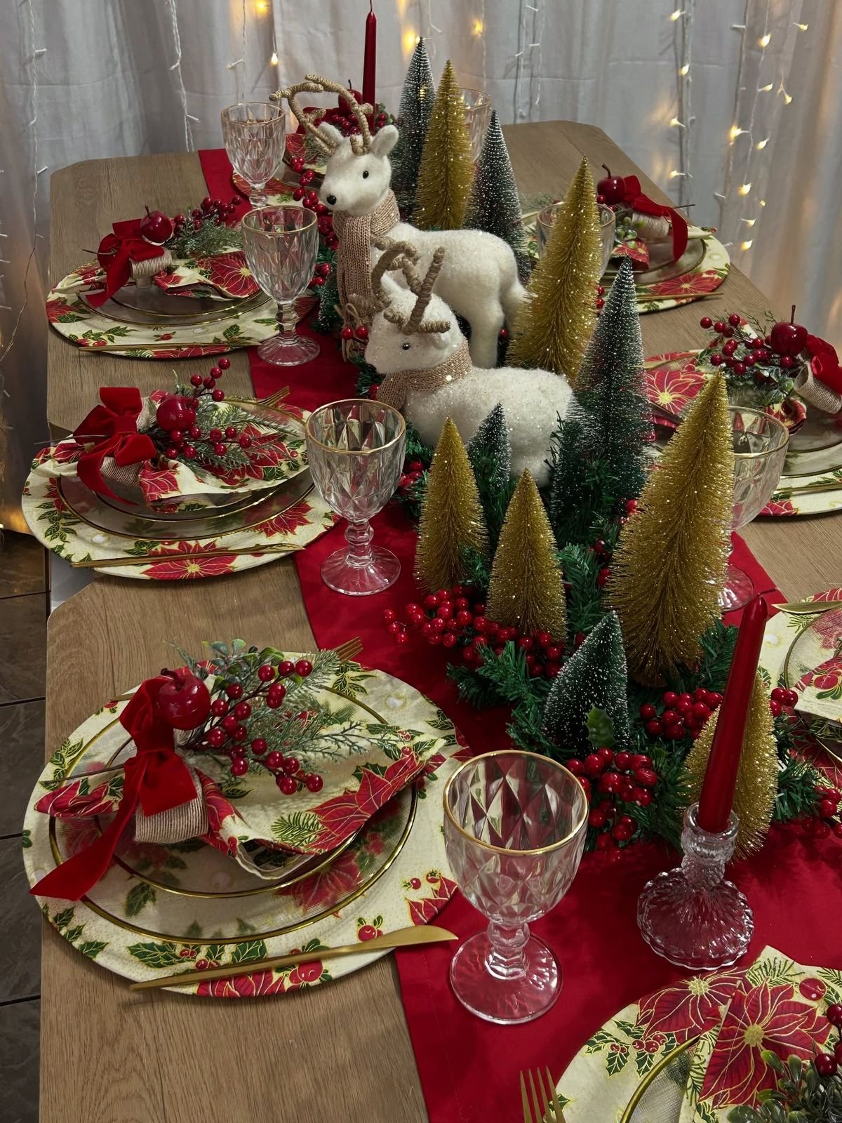 Perfect for Christmas Eve dinners, family gatherings, home celebrations, and festive parties, this setup delivers timeless elegance with a festive touch.