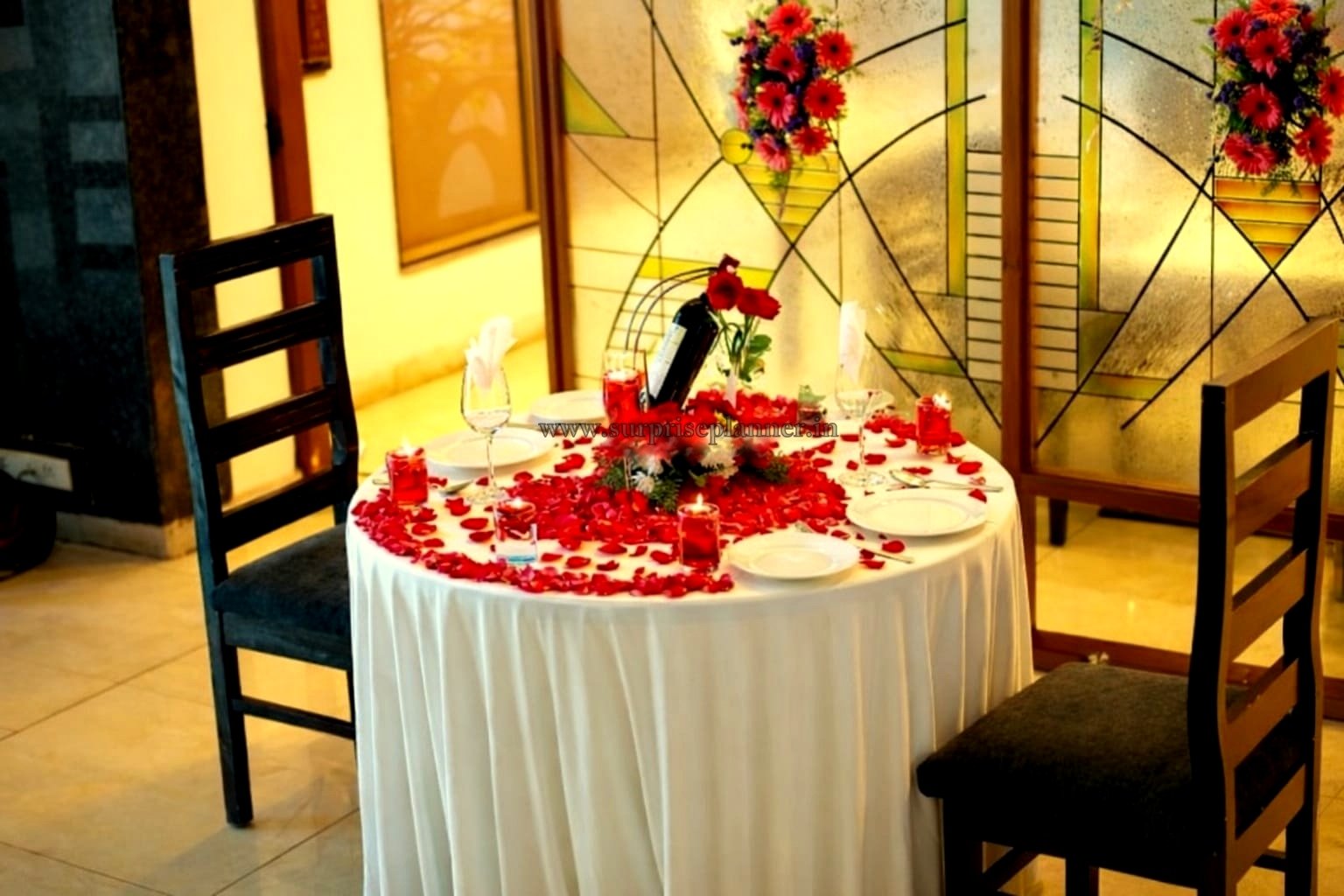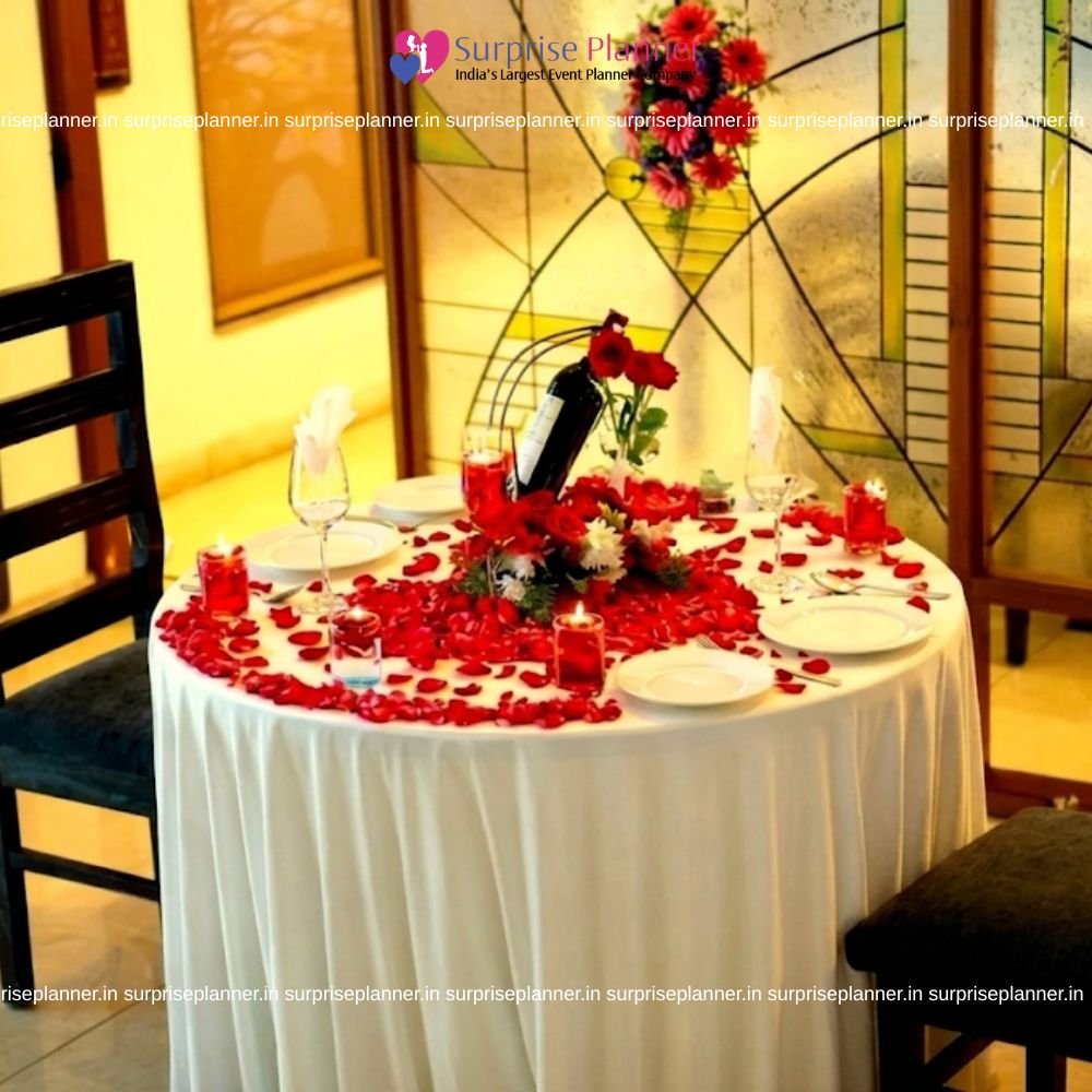 The table is thoughtfully arranged with wine glasses, elegant crockery, candles, and floral décor, giving the entire setup a luxurious and romantic feel. The background décor and artistic wall design further enhance the romantic vibe, making the space ideal for couples who want a memorable and private dinner experience.