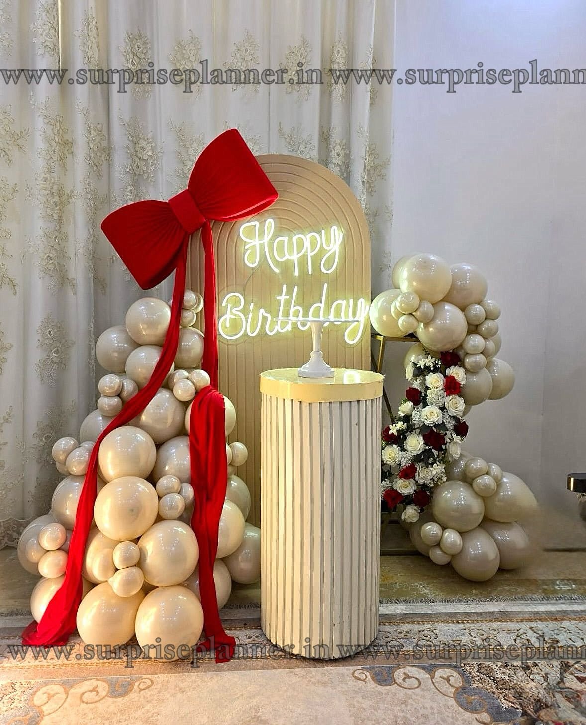 A subtle arched backdrop in a neutral tone provides a chic canvas for the display, while a neon "Happy Birthday" sign adds a contemporary and celebratory touch. Another balloon arrangement with deep red and white roses introduces a romantic and sophisticated element.