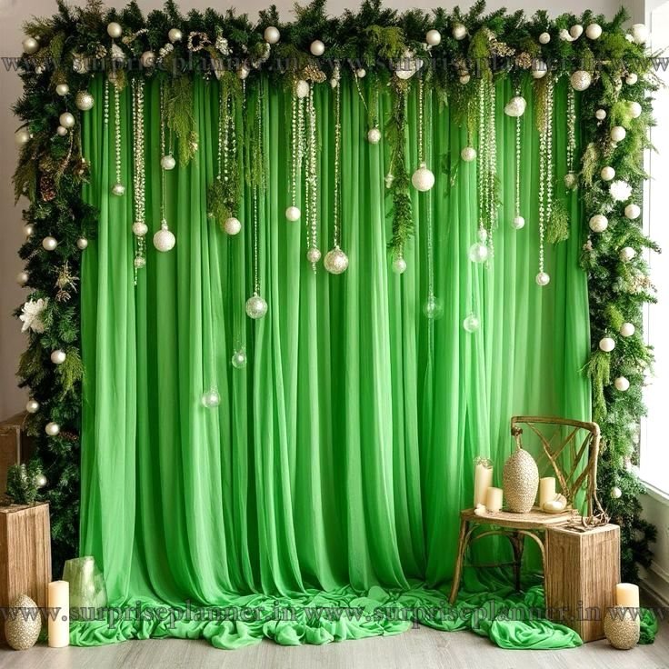 Bring the magic of Christmas alive with our Emerald Green Christmas Luxury Backdrop Decoration, thoughtfully designed for elegant festive celebrations. This setup features a rich green draped fabric backdrop symbolizing the spirit of Christmas, beautifully framed with lush pine garlands, hanging crystal strings, and silver baubles for a refined winter look.
