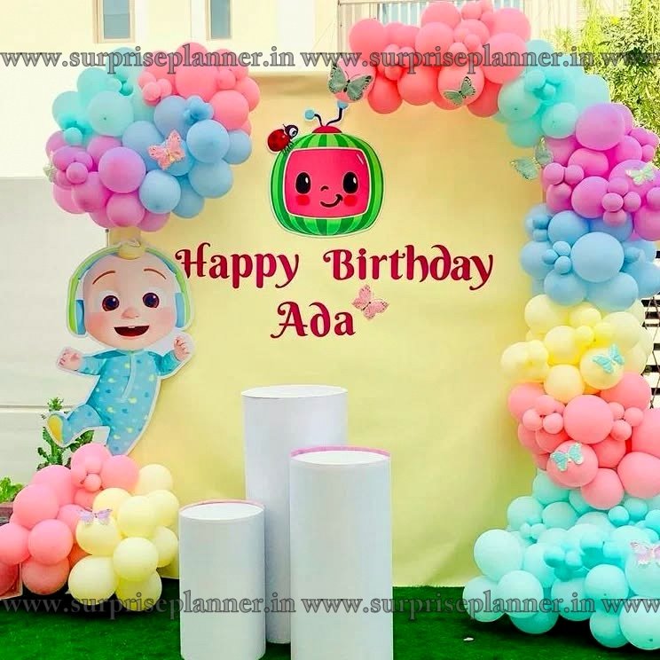 Elevate your child’s birthday celebration with our enchanting Cocomelon balloon arch and backdrop display, perfect for fans of adorable nursery rhyme characters. Crafted with pastel pink, mint, yellow, and light blue balloons, this charming setup features a playful baby figure, whimsical fruit-themed accents, and a cheerful banner personalized with your child’s name. From the carefully arranged balloon clusters to the bright, inviting pedestal stands, every detail helps create a memorable photo spot and a magical ambiance. Constructed using premium-quality materials, our design ensures both durability and captivating aesthetics. It’s an effortless way to transform your party into a vibrant wonderland. Whether hosting an intimate indoor gathering or a cheerful outdoor party, this show-stopping arrangement delights guests of all ages. Make your little one’s birthday experience unforgettable with our lovingly handcrafted creation.