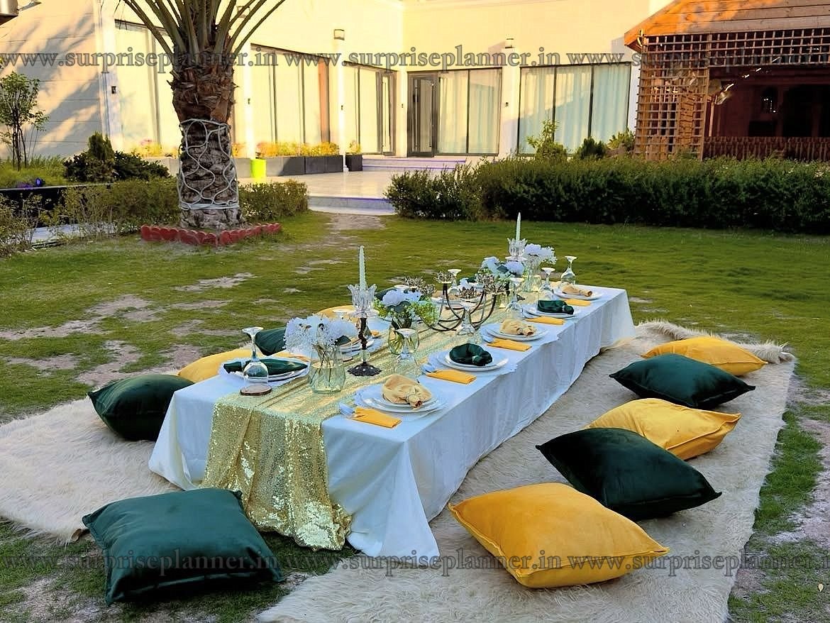 Imagine a magical gathering under the open sky with our beautifully styled outdoor celebration setup. This image captures a long, low table draped in a crisp white tablecloth, adorned with a shimmering gold runner that adds a touch of elegance.