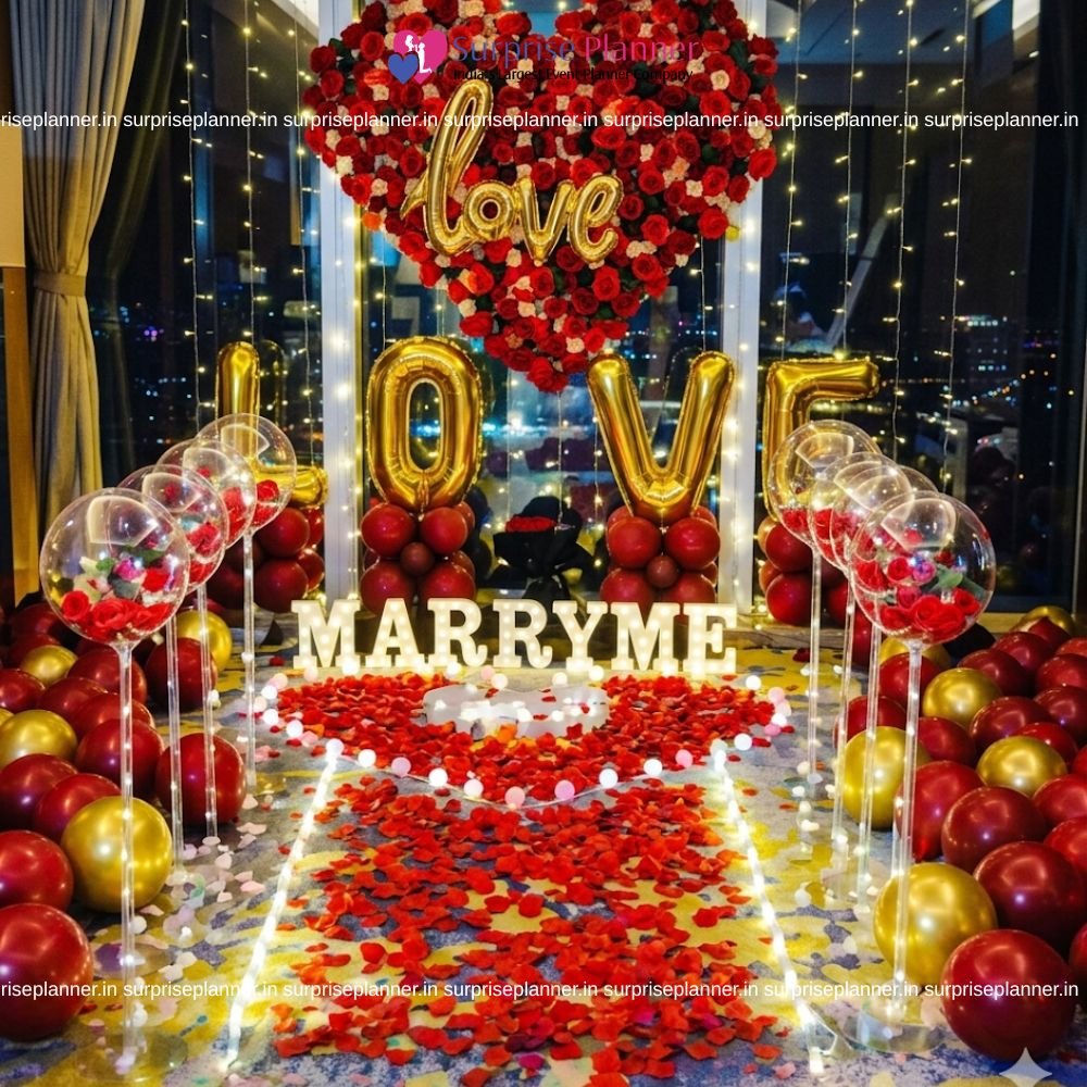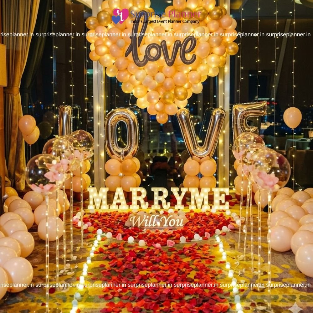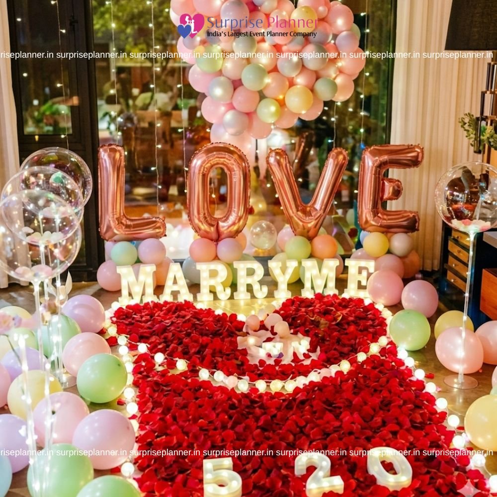 Home Decor for the Fairytale "Marry Me" Proposal With our Fairytale "Marry Me" Proposal Decoration package, you may transform your house into a lovely paradise. This arrangement, which includes a stunning floral arch, twinkling fairy lights, and luxurious drapes, is intended to create a dreamy, storybook-like atmosphere that will establish the ideal tone for your special occasion. The romanticism is enhanced with a grand "Marry Me" LED sign surrounded by exquisite candles and dainty rose petals. To make the proposal unique and intimate, the setup is f...