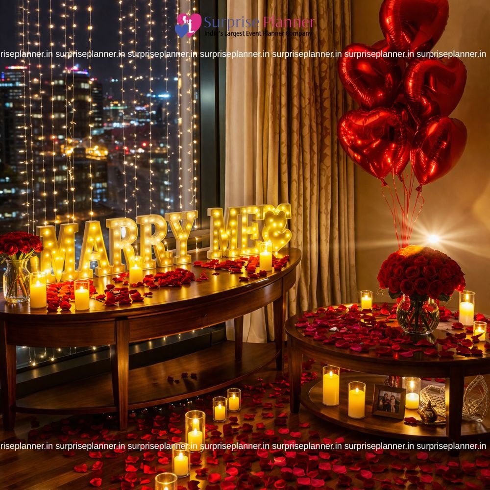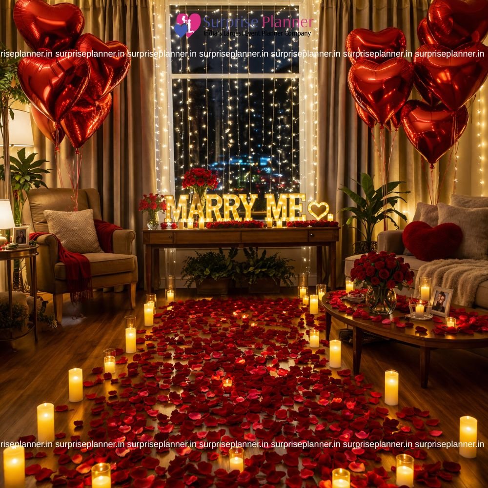 This image captures the essence of a romantic proposal setup designed to sweep anyone off their feet. The room is beautifully decorated with glowing LED candles and a path of rose petals leading to a heartfelt "MARRY ME" sign, elegantly placed on a table adorned with more petals and soft lights. Red heart-shaped balloons float around the space, adding a touch of charm and passion to the ambiance. A cozy seating area and softly lit curtains create a warm, intimate atmosphere perfect for a once-in-a-lifetime moment. The combination of lights, florals, and thoughtful décor makes this scene ideal for a surprise proposal or anniversary celebration. Every detail reflects love, making it a picture-perfect setting to express one’s deepest feelings in the most memorable way.