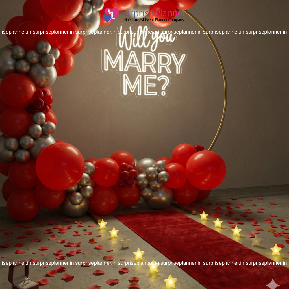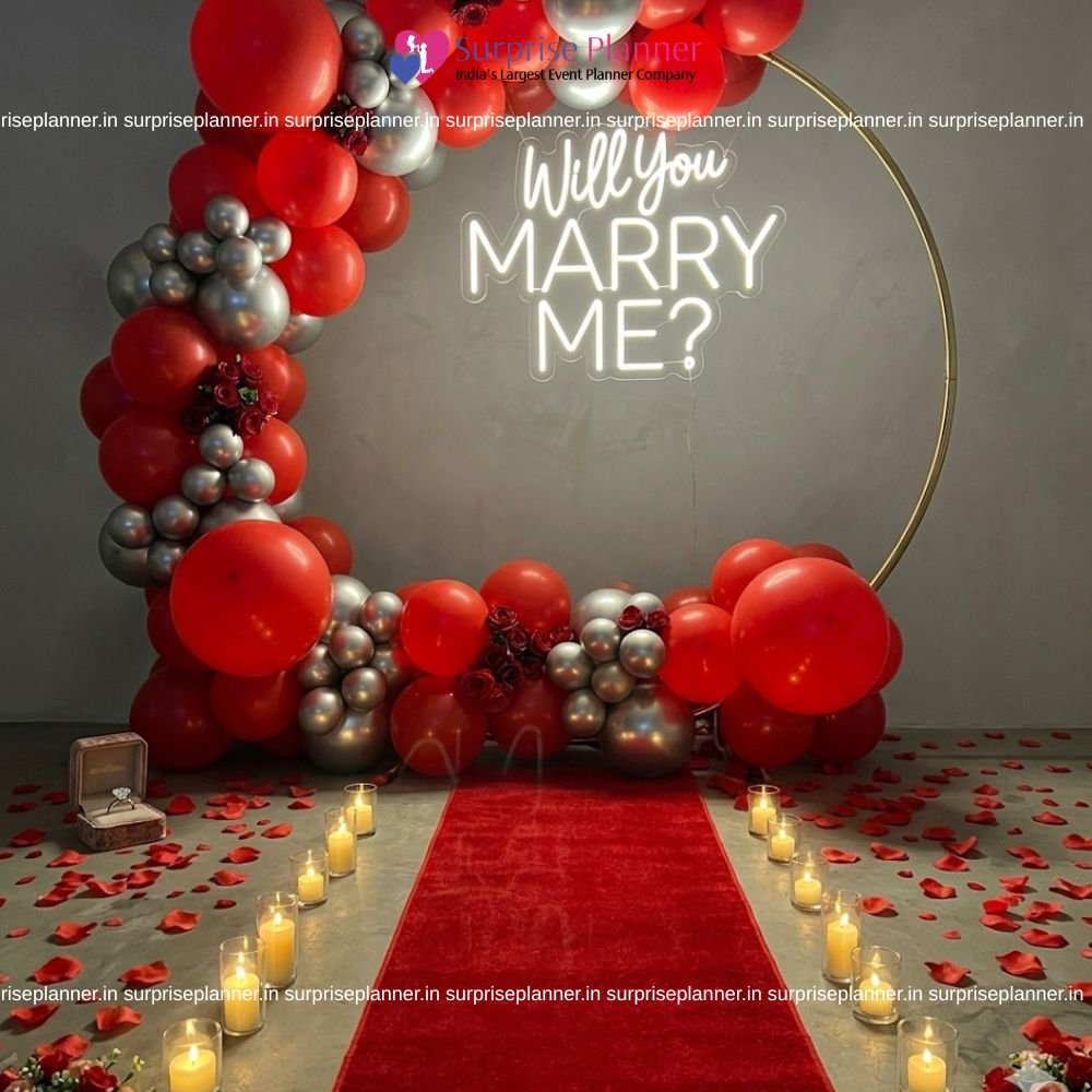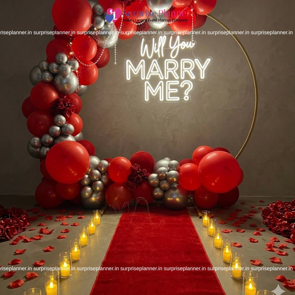 This stunning proposal setup is the perfect blend of elegance and romance, designed to create an unforgettable "Will You Marry Me?" moment. The centerpiece is a modern gold circular arch lavishly decorated with a striking mix of red and metallic silver balloons, giving it a bold yet classy look. At the heart of the arch glows a captivating neon sign that pops the big question in glowing white letters. A red carpet aisle, lined with warm LED candles and sprinkled rose petals, leads to the romantic focal point, guiding your partner toward a life-changing moment. The overall ambiance exudes passion, love, and thoughtful planning, making it ideal for a proposal that will be remembered forever. This visually striking setup promises to set the perfect mood for saying “Yes” in style.