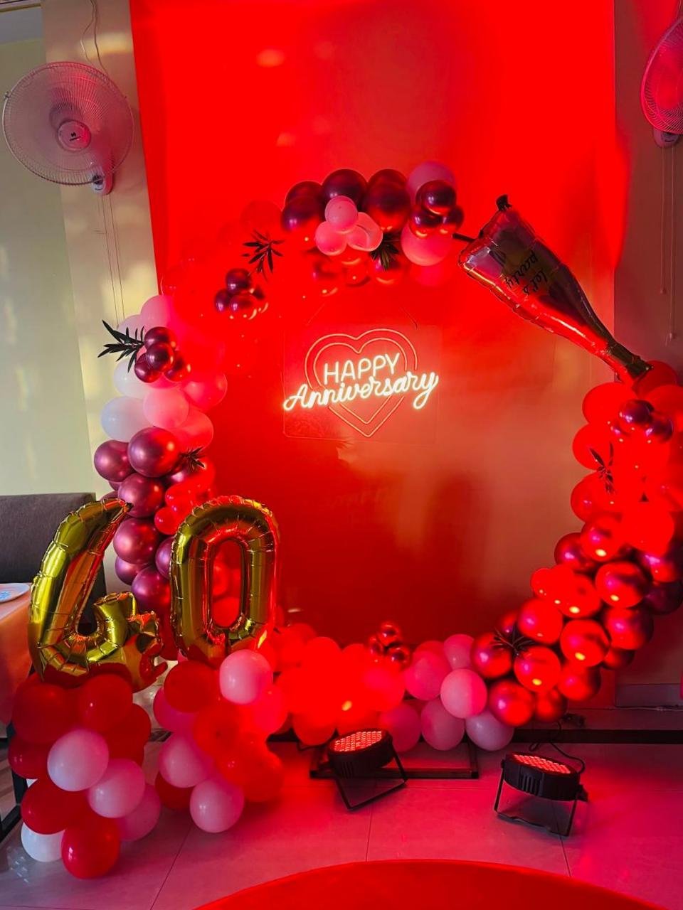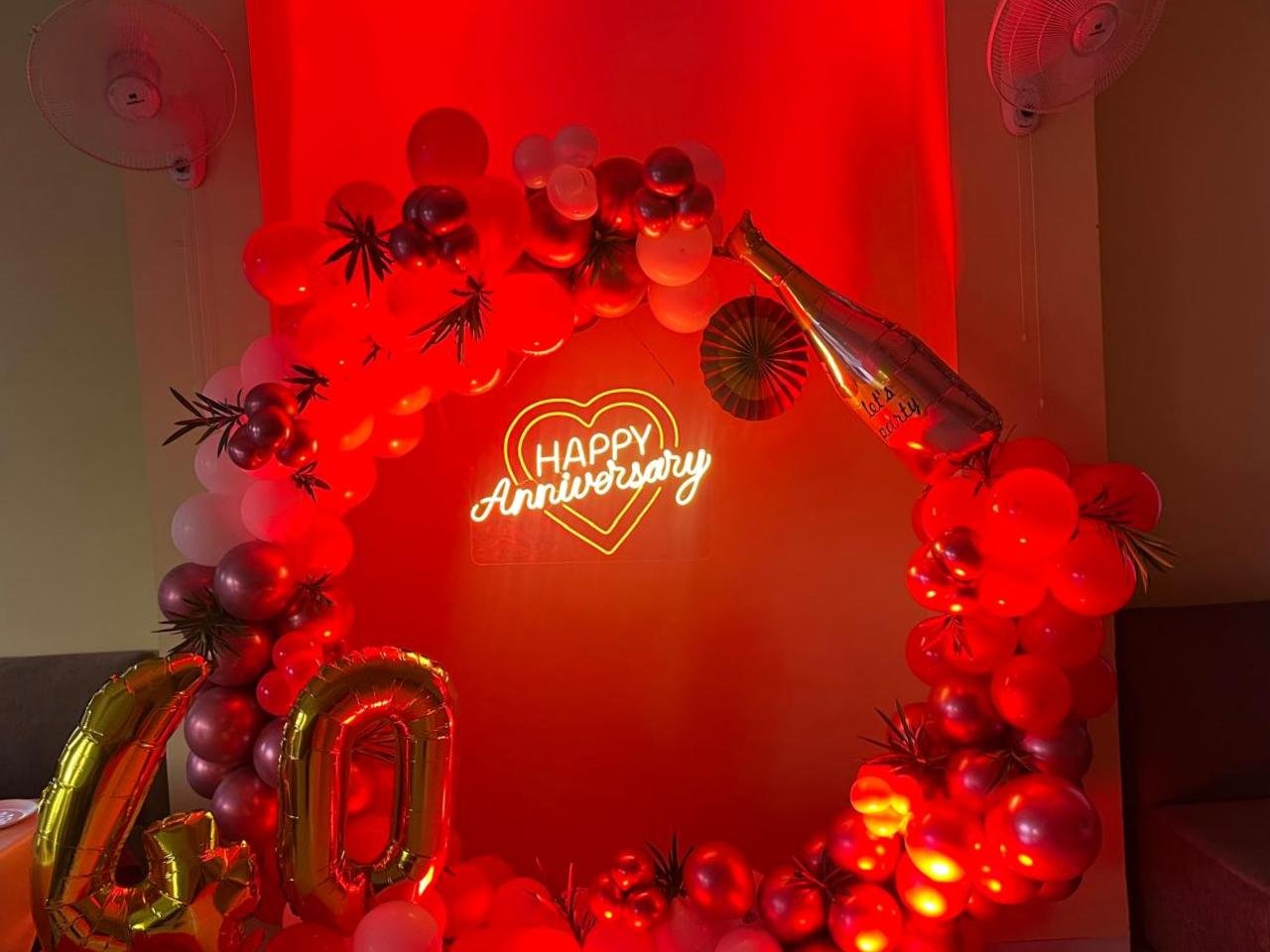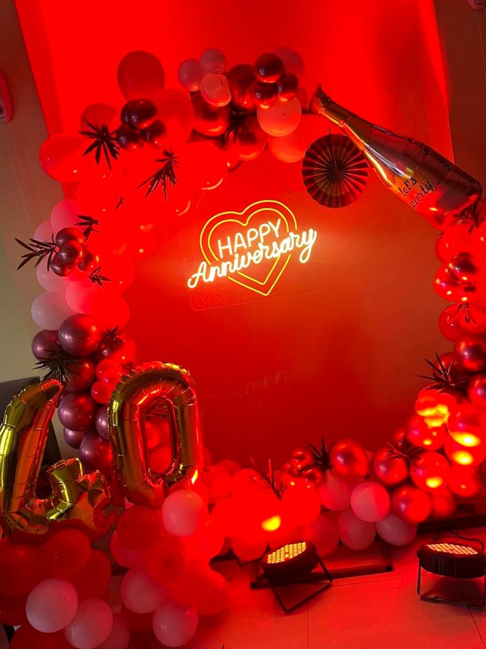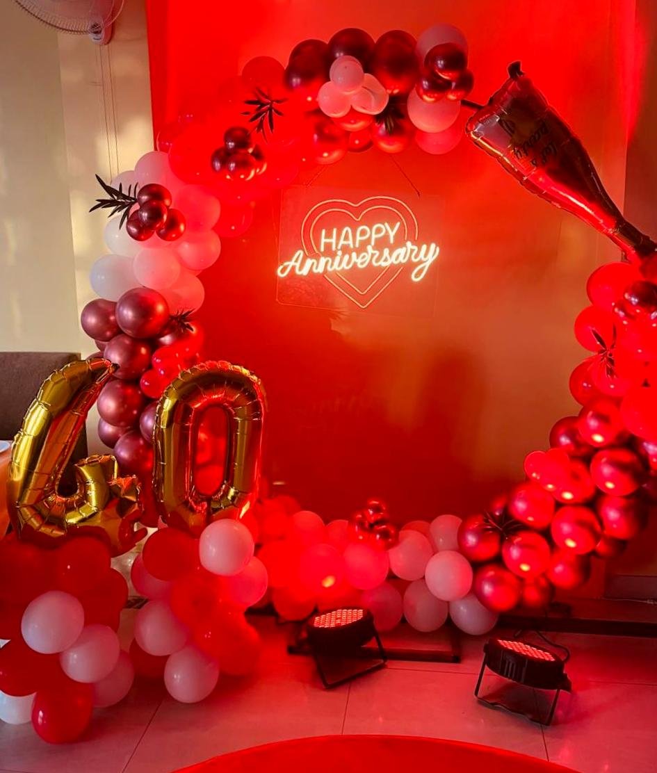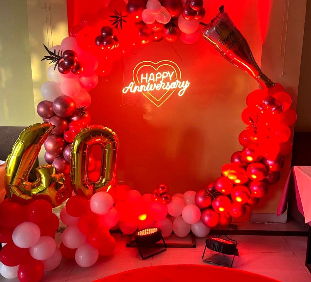 Celebrate your amazing anniversary with this Happy Anniversary Balloon Ring Decoration. This lovely arrangement features a large circular balloon arch with towering balloons in exotic colors like gold, silver, white and deep purple and romantic motifs like the "Happy Anniversary" banner , heart-shaped balloons and subtle flowers decorated accents. These decorations are ideal as a photo backdrop and the centerpiece of the event, adding a touch of luxury and glamor to your anniversary celebration. Our professional decorators customize the furnishings to suit your needs, creating an unforgettable experience. Make your anniversary special with this beautiful and touching balloon ring decoration.
