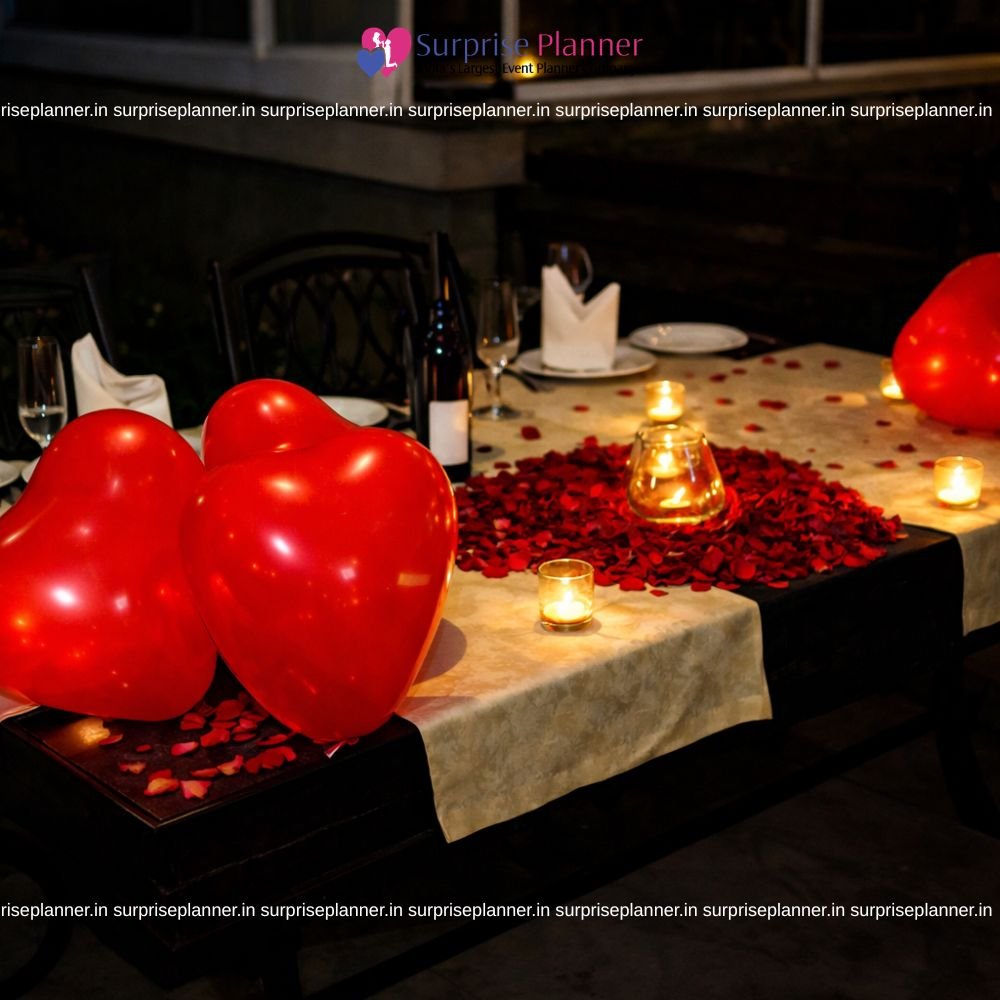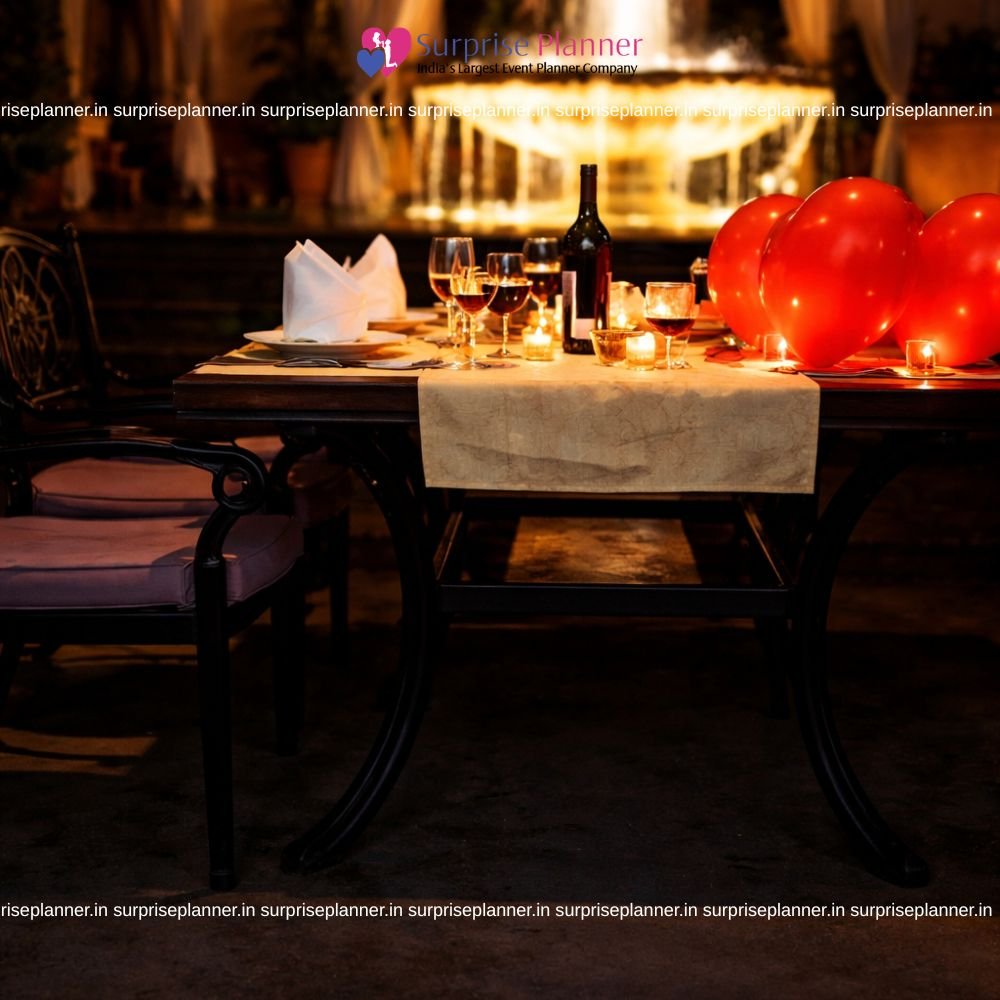 The table is artistically decorated with glowing candles, fresh rose petals, heart-shaped red balloons, and elegant table settings. The warm golden lighting from the fountain and surrounding architecture enhances the romantic vibe, making it perfect for proposals, anniversaries, birthdays, or surprise date nights in Delhi.