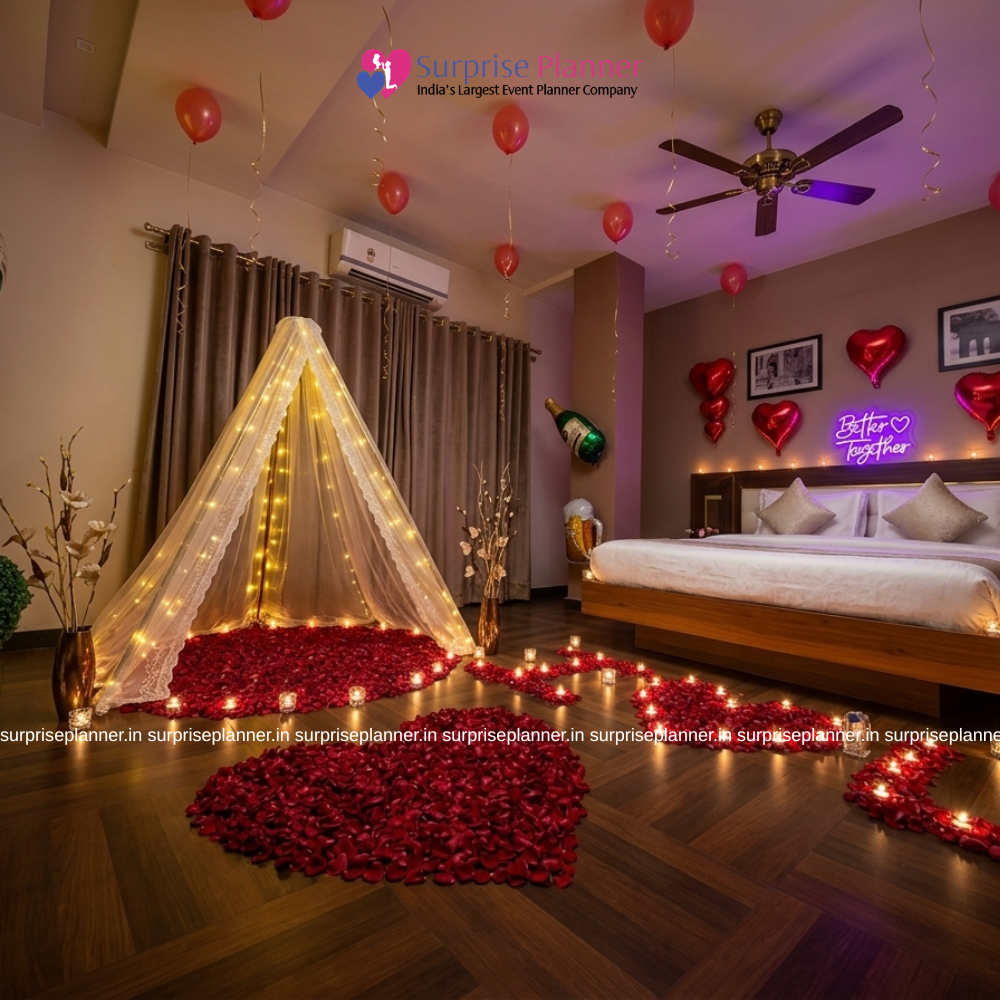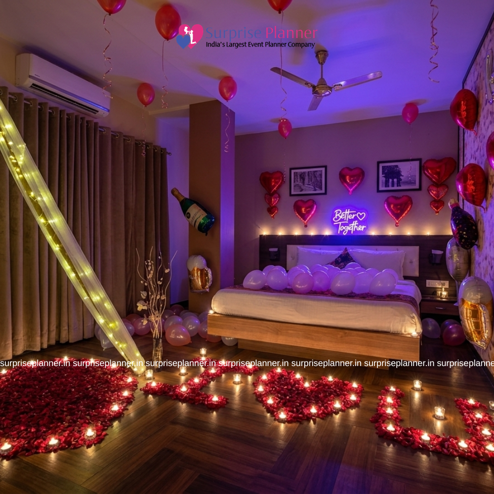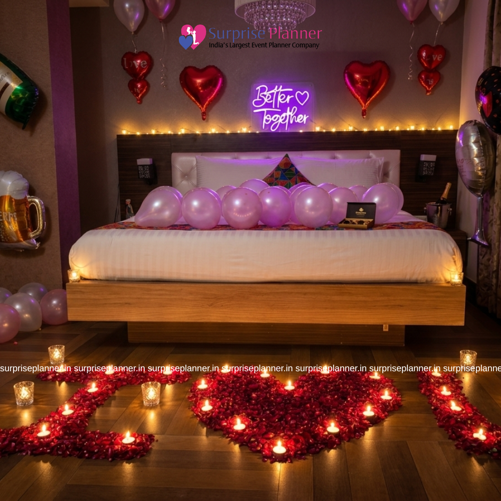 This room is filled with a large bed,plush cushions, low tables, and colorful rugs, embracing the bohemian aesthetic, with love balloons, decorative candles, and Props as shown in the picture