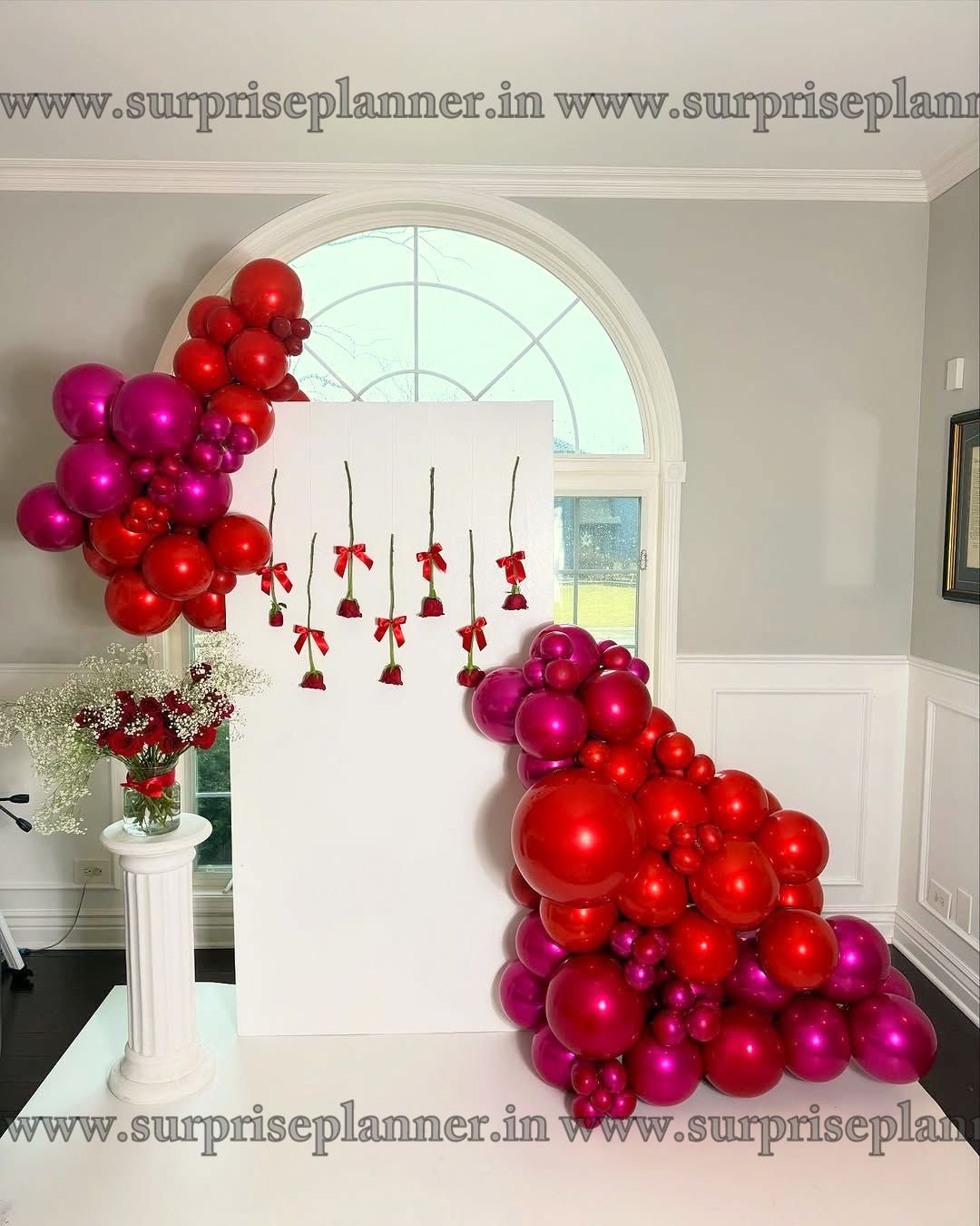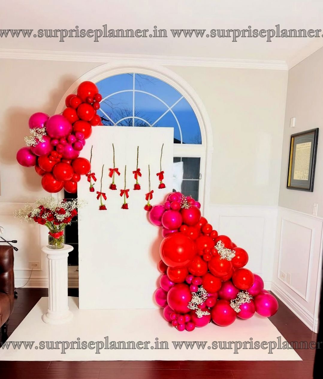 Turn your Valentine’s Day into a picture-perfect romantic moment with our Love in Bloom Valentine’s Day Decoration Setup. This elegant décor features a luxurious red and pink balloon installation, beautifully framing a minimal white backdrop adorned with hanging red roses tied with satin bows.