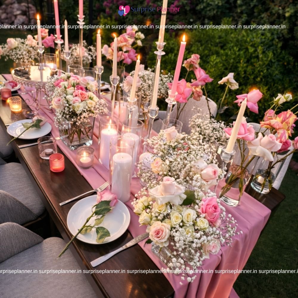 Create a magical and intimate outdoor experience with our Luxury Blush Pink Garden Dinner Setup, designed to turn any celebration into an unforgettable moment. This elegant decor features a beautifully styled wooden dining table adorned with a flowing blush pink runner, premium floral arrangements, and soft candlelight that adds warmth and romance to the ambiance.