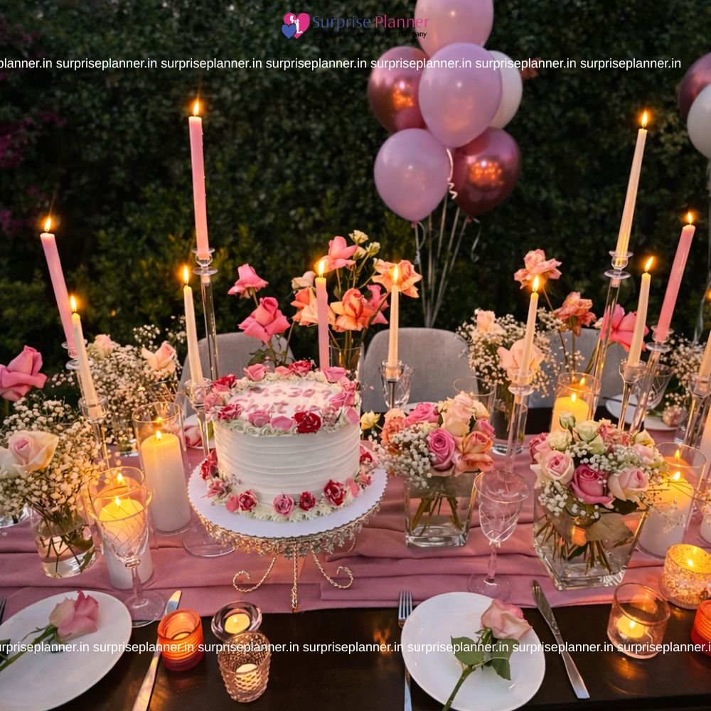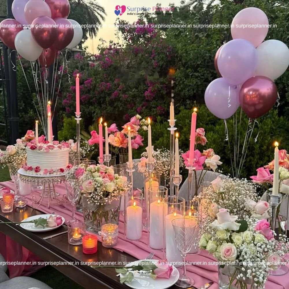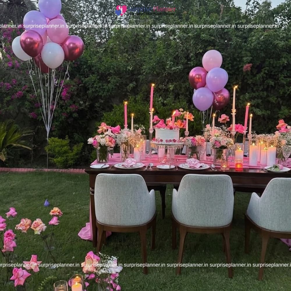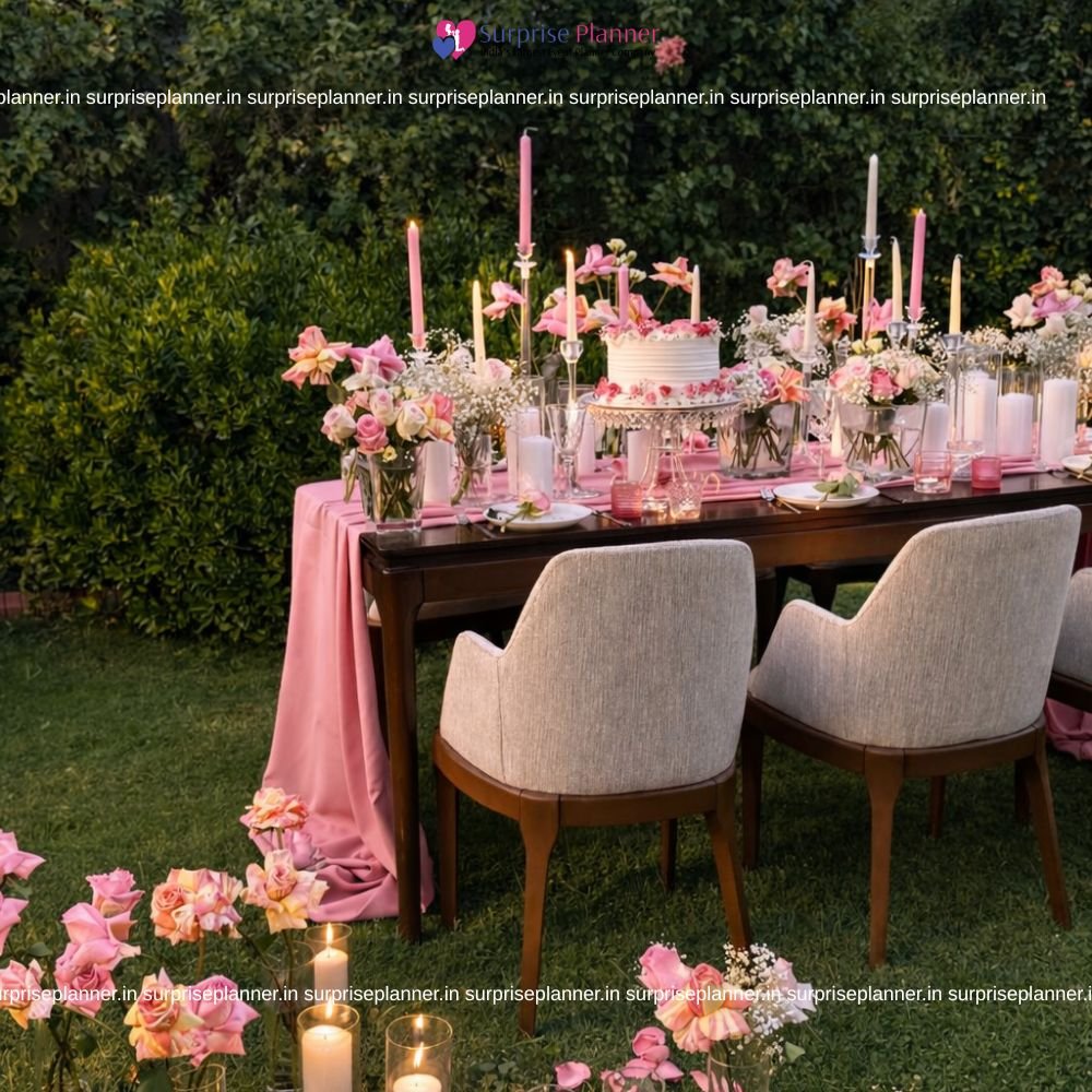 Comfortable upholstered chairs complement the setup, ensuring both style and relaxation for your guests. Ideal for romantic dinners, birthdays, anniversaries, proposals, or private celebrations, this décor transforms any garden or outdoor space into a luxurious venue.