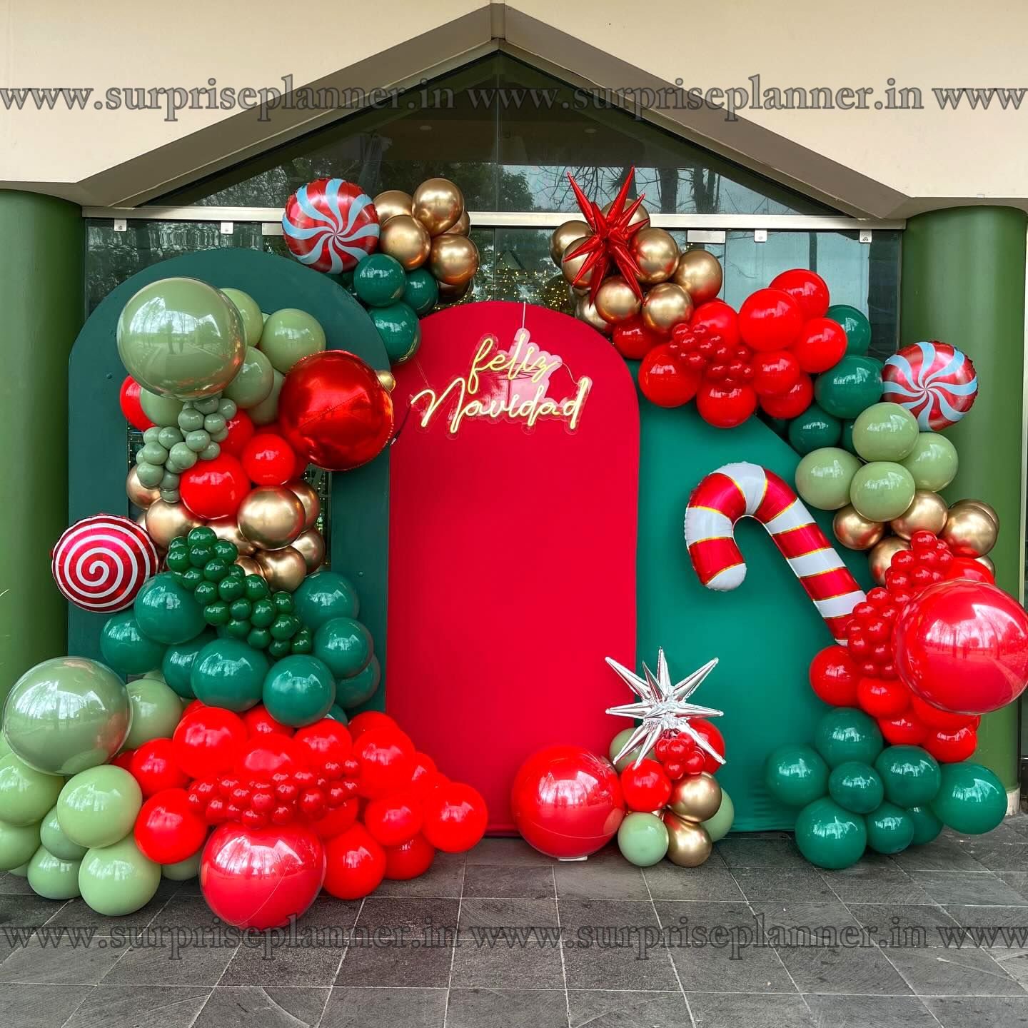 Accented with candy cane balloons, peppermint swirl balloons, star-shaped foil elements, and premium chrome balloons, the setup is completed with a glowing “Feliz Navidad” neon sign, making it perfect for photo ops and festive branding. Ideal for home entrances, hotels, cafés, malls, office parties, Christmas carnivals, and influencer shoots, this décor instantly transforms any space into a magical holiday wonderland.