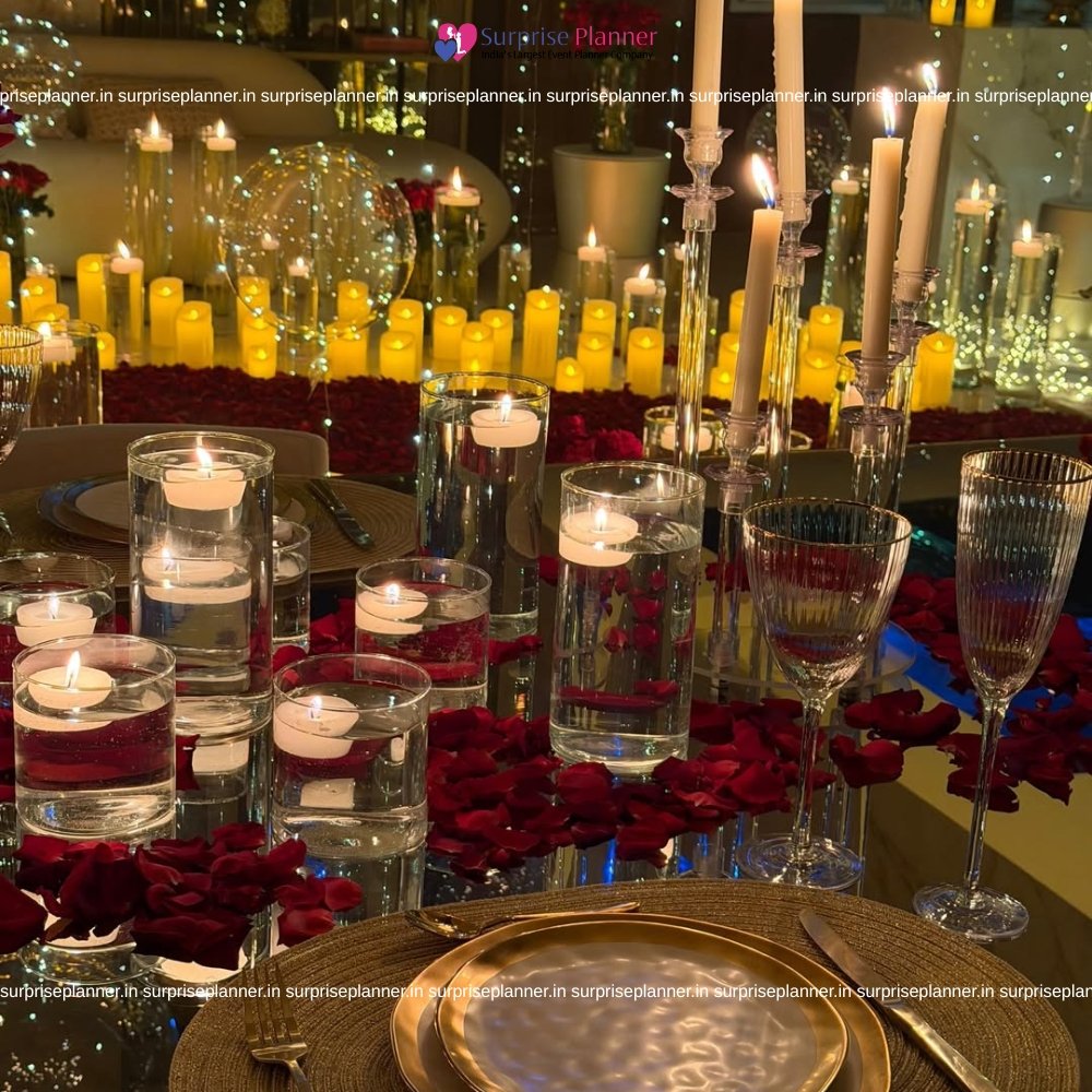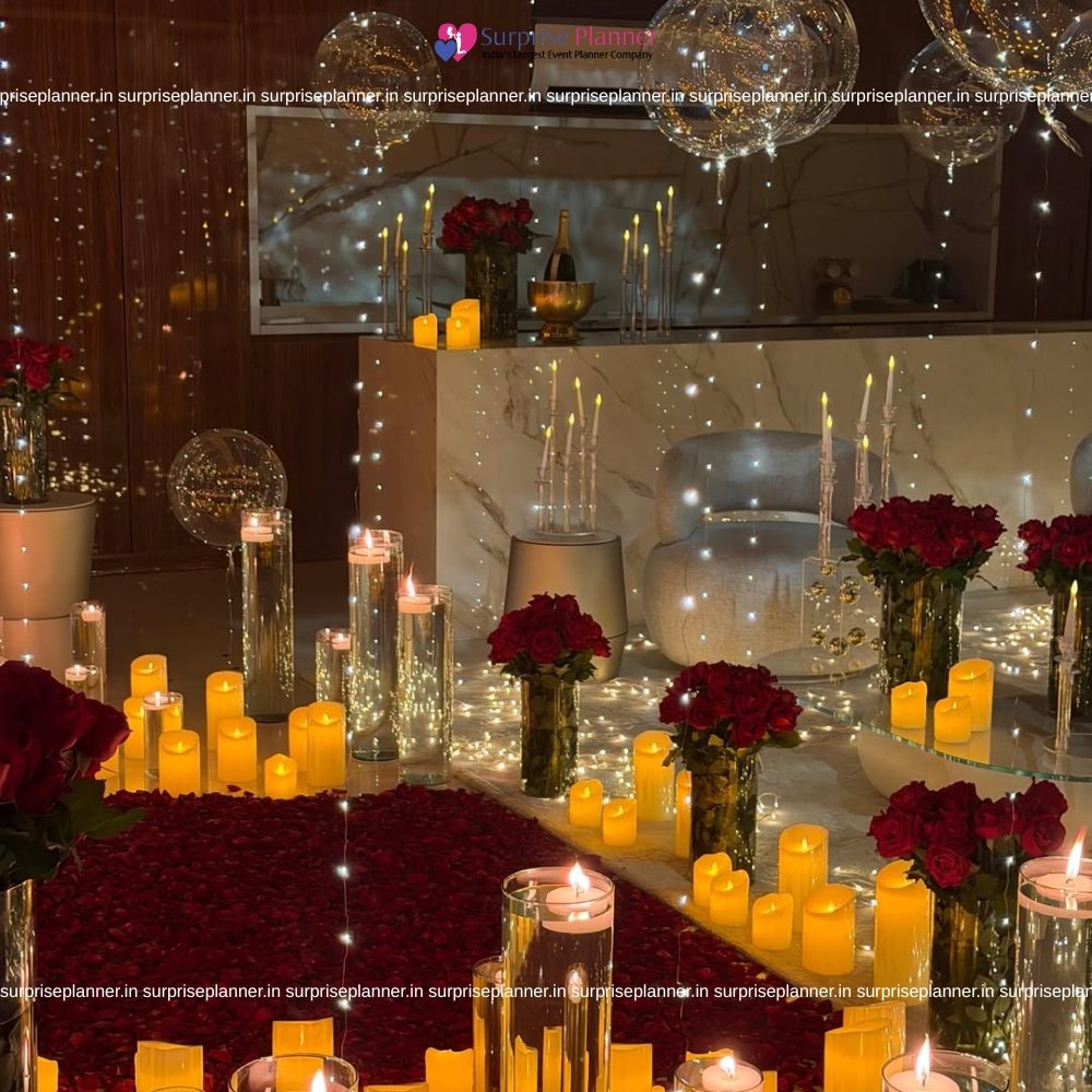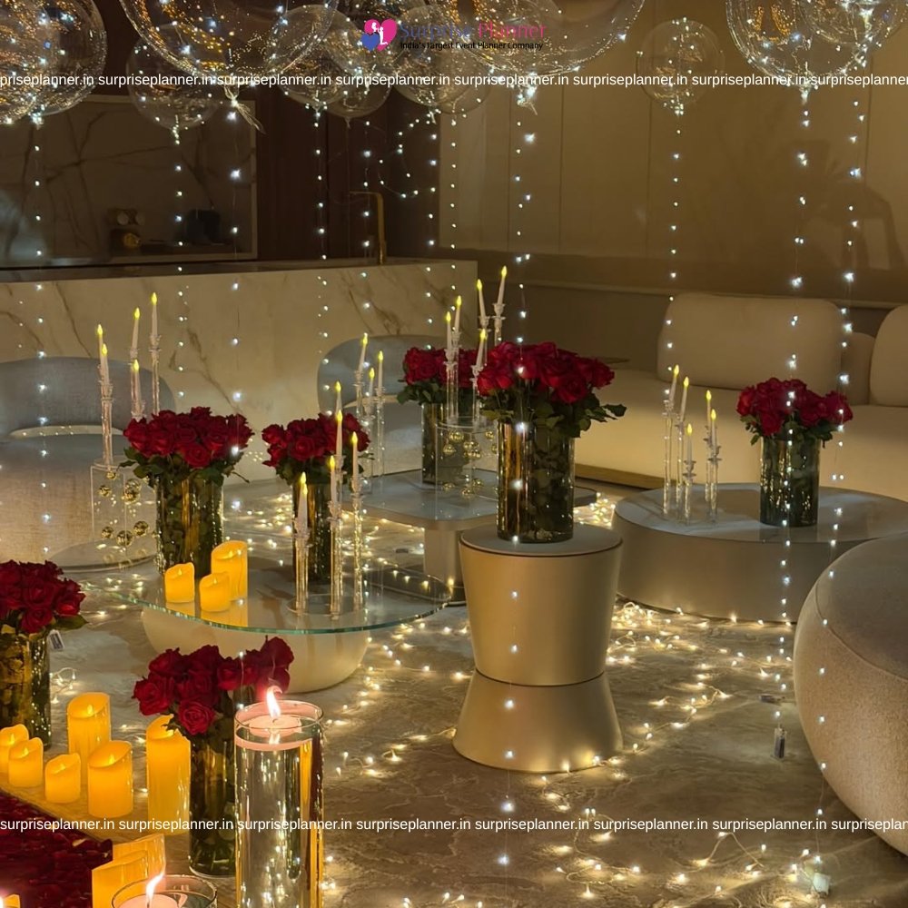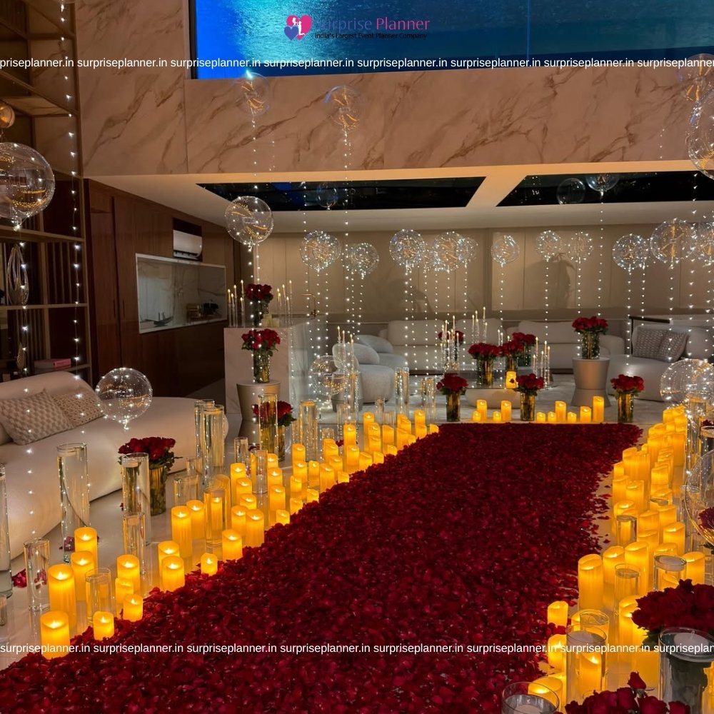 Ideal for private indoor spaces, luxury villas, hotel suites, or penthouses, this setup ensures privacy while delivering a premium visual experience. Whether you’re planning a surprise proposal or a romantic celebration, this décor guarantees a memorable and Instagram-worthy moment.