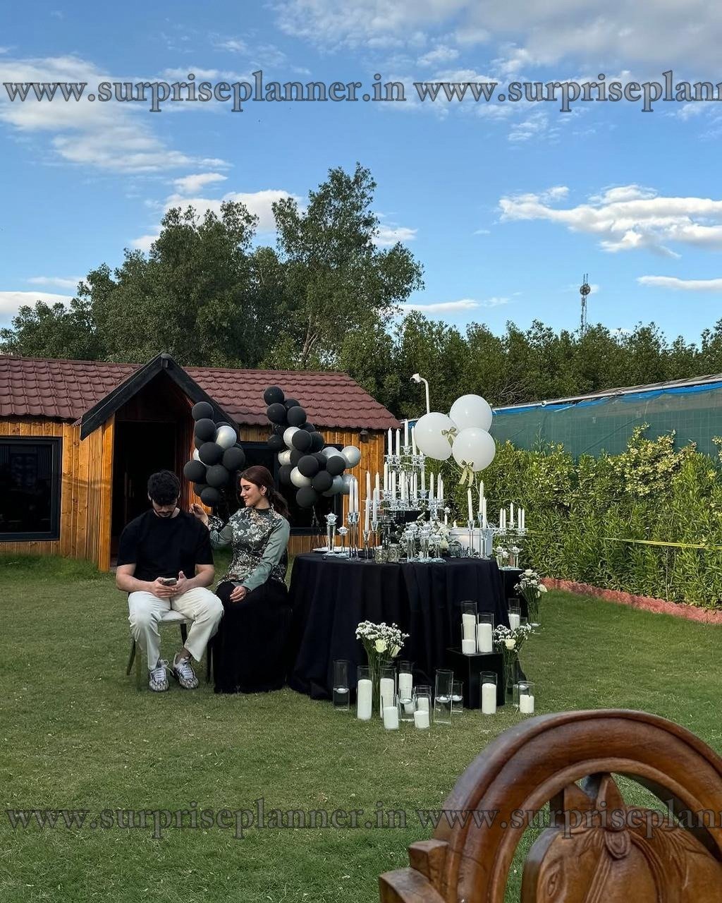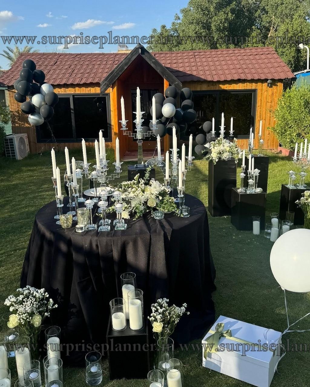 Transform your backyard into a luxurious romantic haven with this elegant home setup. Featuring chic black tablecloths, tall white candles in crystal holders, delicate white floral arrangements, and a mix of black and silver balloons, this design exudes timeless sophistication. Soft white candles placed around the setup create a warm, intimate ambiance, perfect for proposals, anniversaries, or surprise romantic dinners. Gift boxes and white balloons with gold ribbons add a thoughtful, celebratory touch. Surrounded by natural greenery and clear skies, this outdoor arrangement offers a stunning, private setting for unforgettable moments at home. Ideal for couples looking to create magical memories without leaving the comfort of their home, this romantic setup blends style and emotion perfectly.