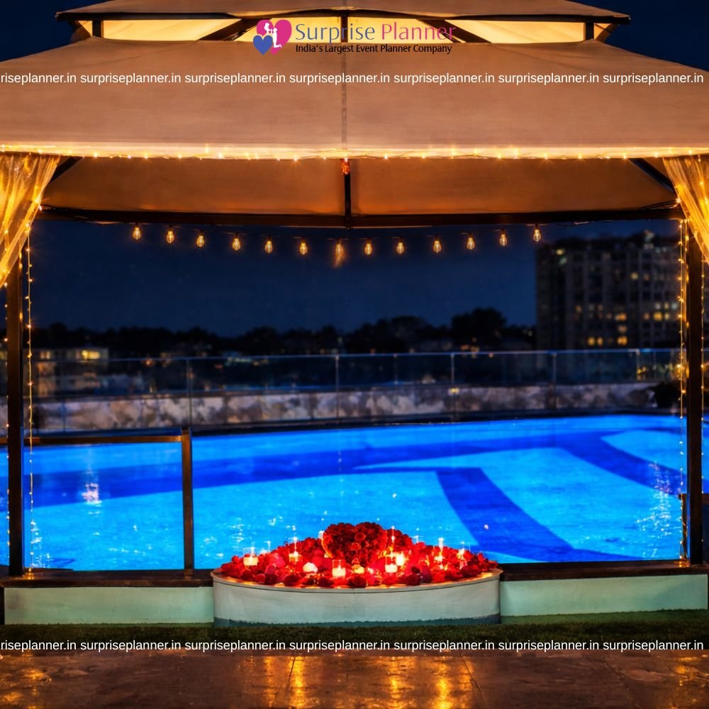 Create a magical romantic evening with a luxury poolside candlelight dinner in Pune, designed for couples who want an intimate and unforgettable experience. This elegant setup features a beautifully decorated private cabana beside a glowing swimming pool, creating a serene and romantic ambiance perfect for special celebrations.