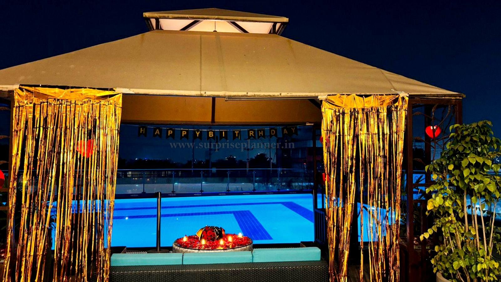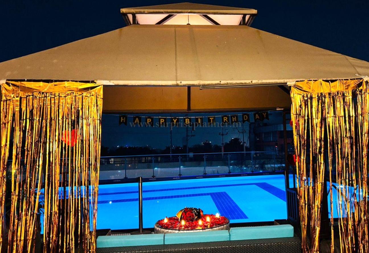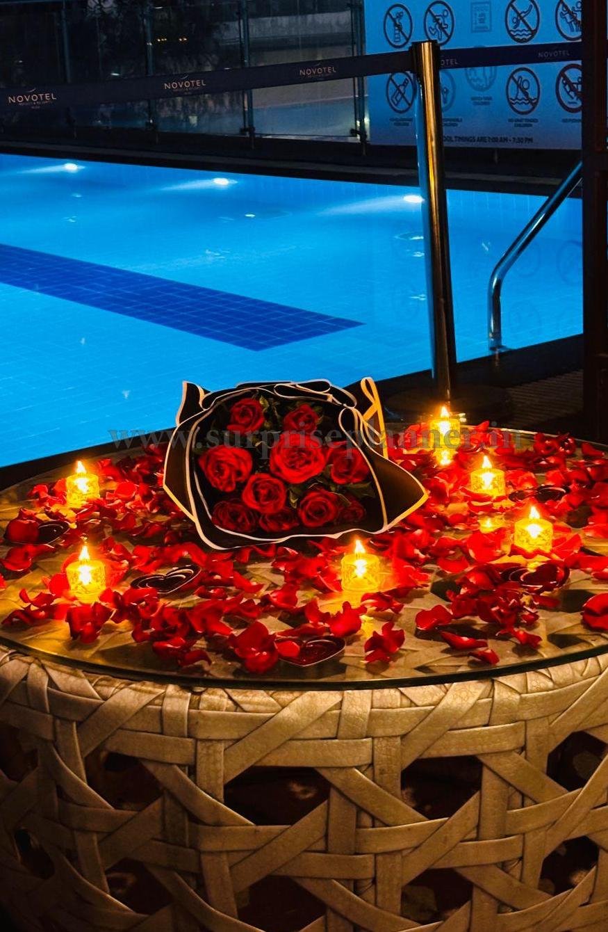 Overlooking the illuminated pool, the entire setup offers a dreamy setting perfect for romantic date nights, birthday surprises, anniversaries, or marriage proposals in Pune. The combination of candlelight, floral décor, and the peaceful poolside view creates a charming and memorable experience for couples looking to celebrate love.