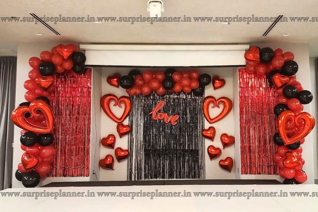 Make this Valentine’s Day unforgettable with our Luxury Red & Black Valentine’s Love Backdrop Decoration, designed for couples who love bold romance and glamorous aesthetics. This stunning setup features rich red and black balloon arches, metallic heart balloons, shimmering foil curtains, and a glowing “Love” centerpiece—perfect for proposals, romantic surprises, private Valentine’s parties, hotel ballroom décor, or home celebrations.