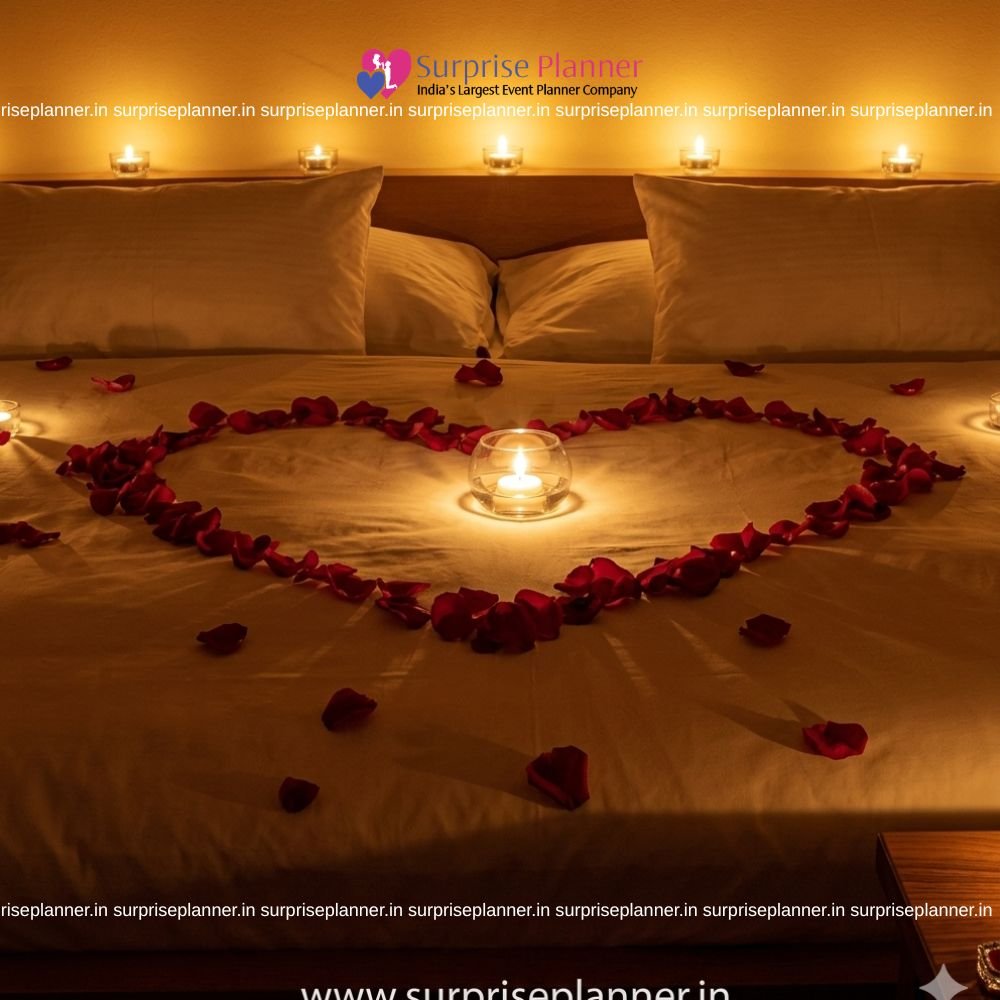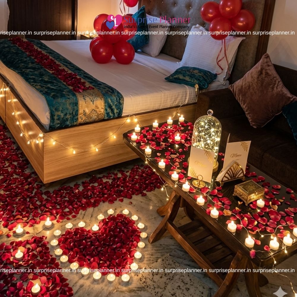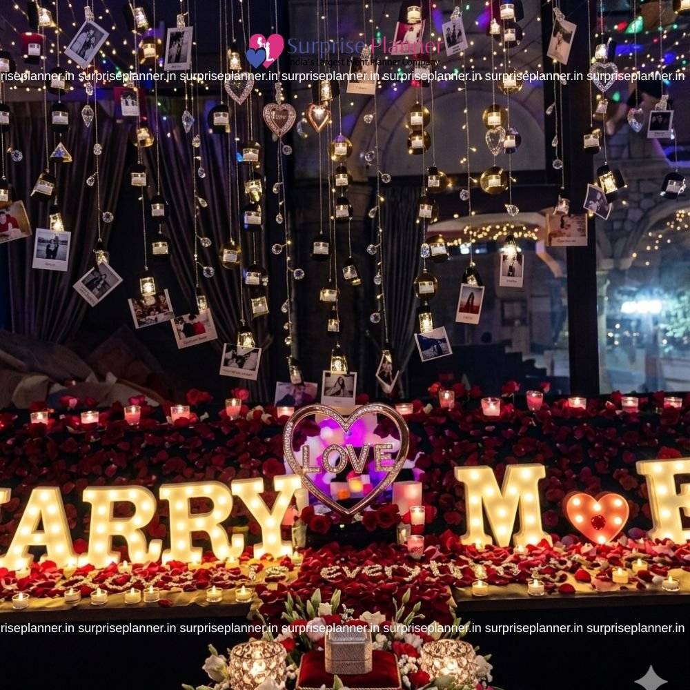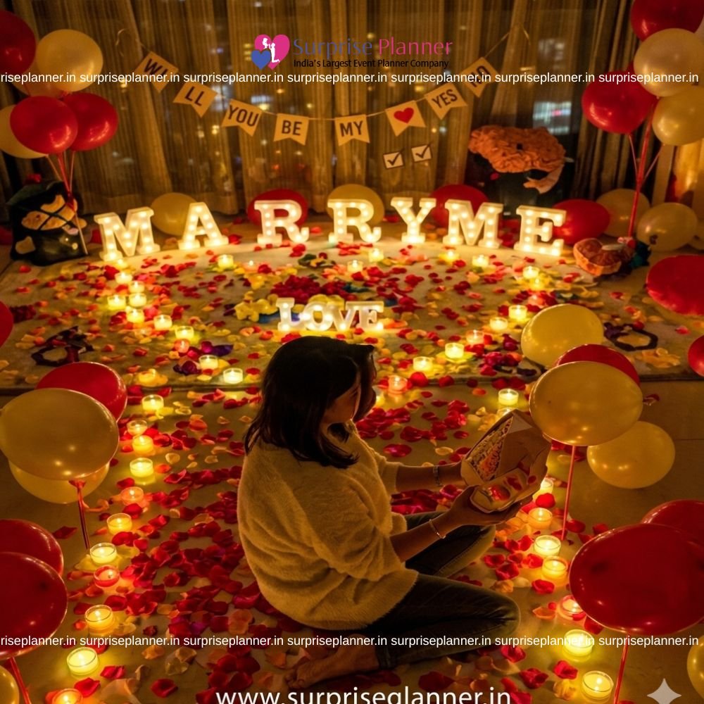 Marriage Proposal Decoration| Marriage Decor Set-up with Flowers & Candles Pathway at home in all major metro cities Something Special however not too mushy? Propose your love with many rose petals and candles! A pathway fabricated from candles and rose petals resulting in a heart and you! MARRIAGE PROPOSAL DECORATION could be a terribly special a part of anyone's life. Thus however are you able to make certain you are crafting the proper thanks to pop the question? Every Marriage proposal Decoration is special and life dynamical despite however grand or easy. we all know you wish your proposal to bring tears of happiness in her eyes. that is why whenever crafted this proposal apt for you to pop the question to the love of your life! A pathway is going to be created out of candles and rose petals which might cause a heart. you will have this whole setup prepared by us before your honey gets home. Once she gets home be prepared with all the candles lit and after all down on your knee within the center form crafted out of candles and rose petals. You can additionally add cake, wine, balloon decoration from customizations to form this proposal a lot.