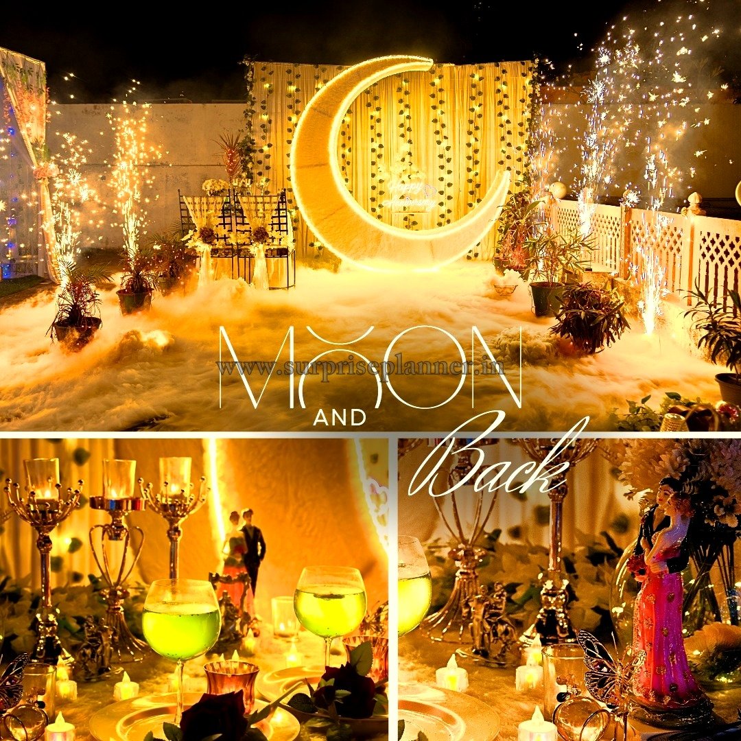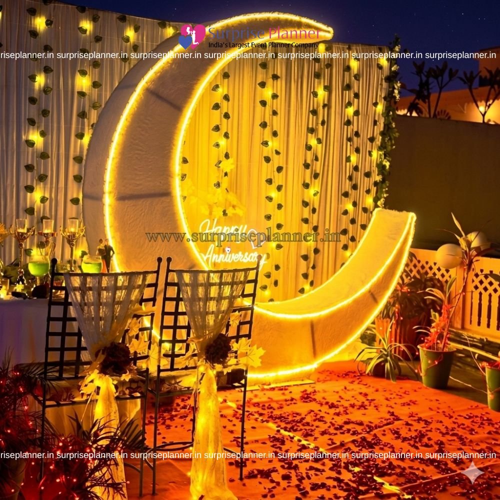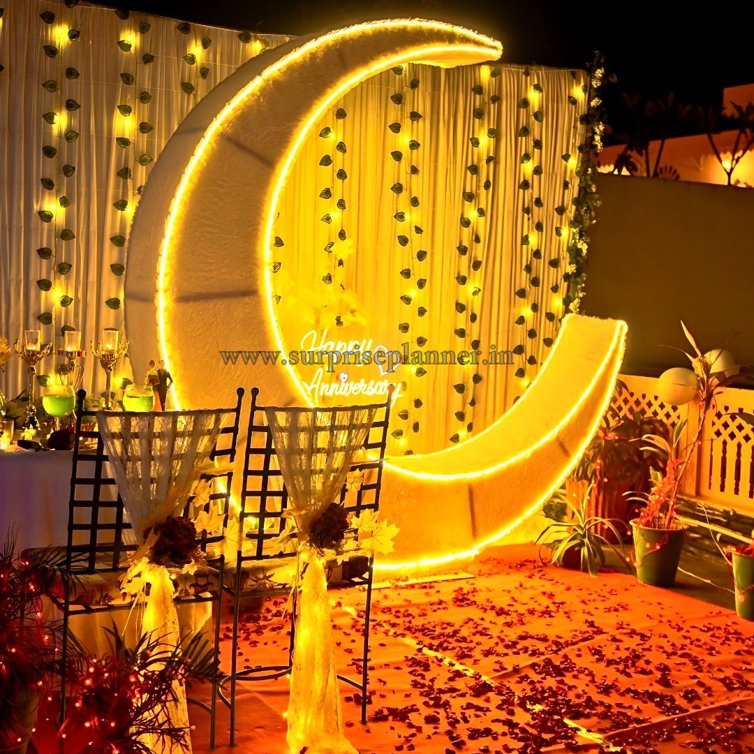 Turn your special moment into a magical fairytale with our Moonlit Fairytale Proposal, a breathtaking rooftop romantic setup inspired by the beauty of the moon and stars. This grand décor features a glowing crescent moon installation as the centerpiece, illuminated with warm golden lights that create a dreamy, celestial ambiance.