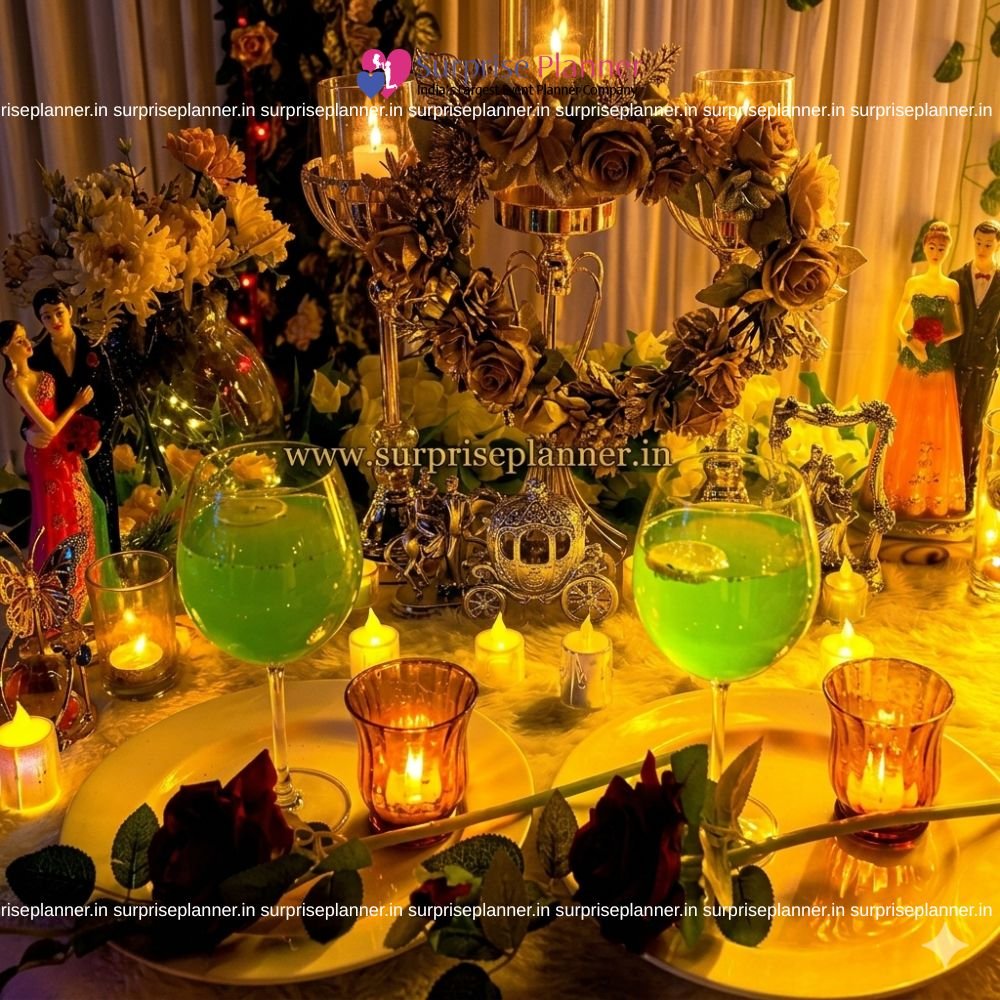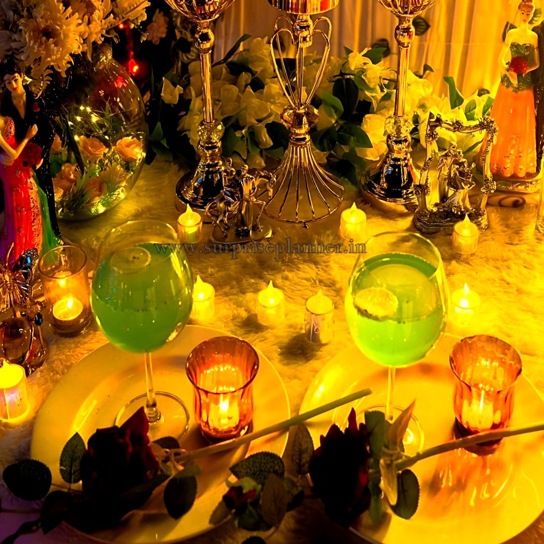 The dining table is styled with premium candelabras, glass candle holders, fresh roses, and romantic figurines that symbolize eternal love. The golden lighting theme creates an intimate and cozy atmosphere, ideal for a surprise marriage proposal, anniversary celebration, pre-wedding shoot, or luxury birthday surprise.