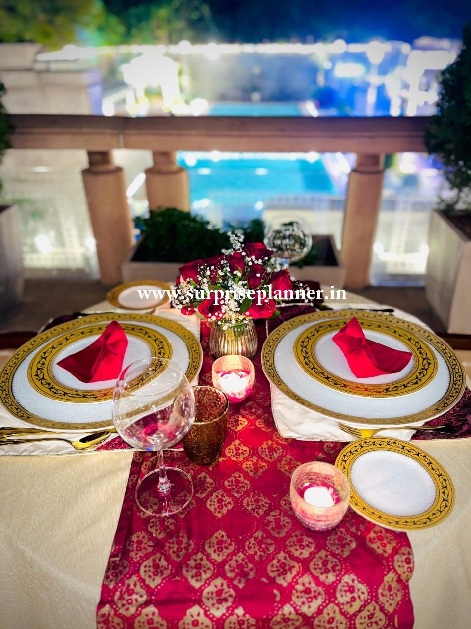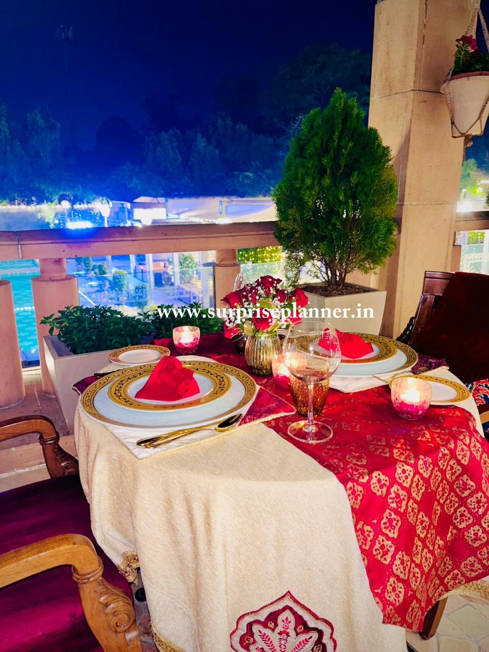 Create unforgettable Valentine’s Day memories with our Moonlit Love Valentine’s Day Balcony Candlelight Dinner, designed for couples who desire privacy, elegance, and breathtaking views. Set under the open sky, this intimate dining experience features a beautifully styled table with premium linen, royal crockery, golden cutlery, crystal wine glasses, and neatly folded red napkins that symbolize love and passion.