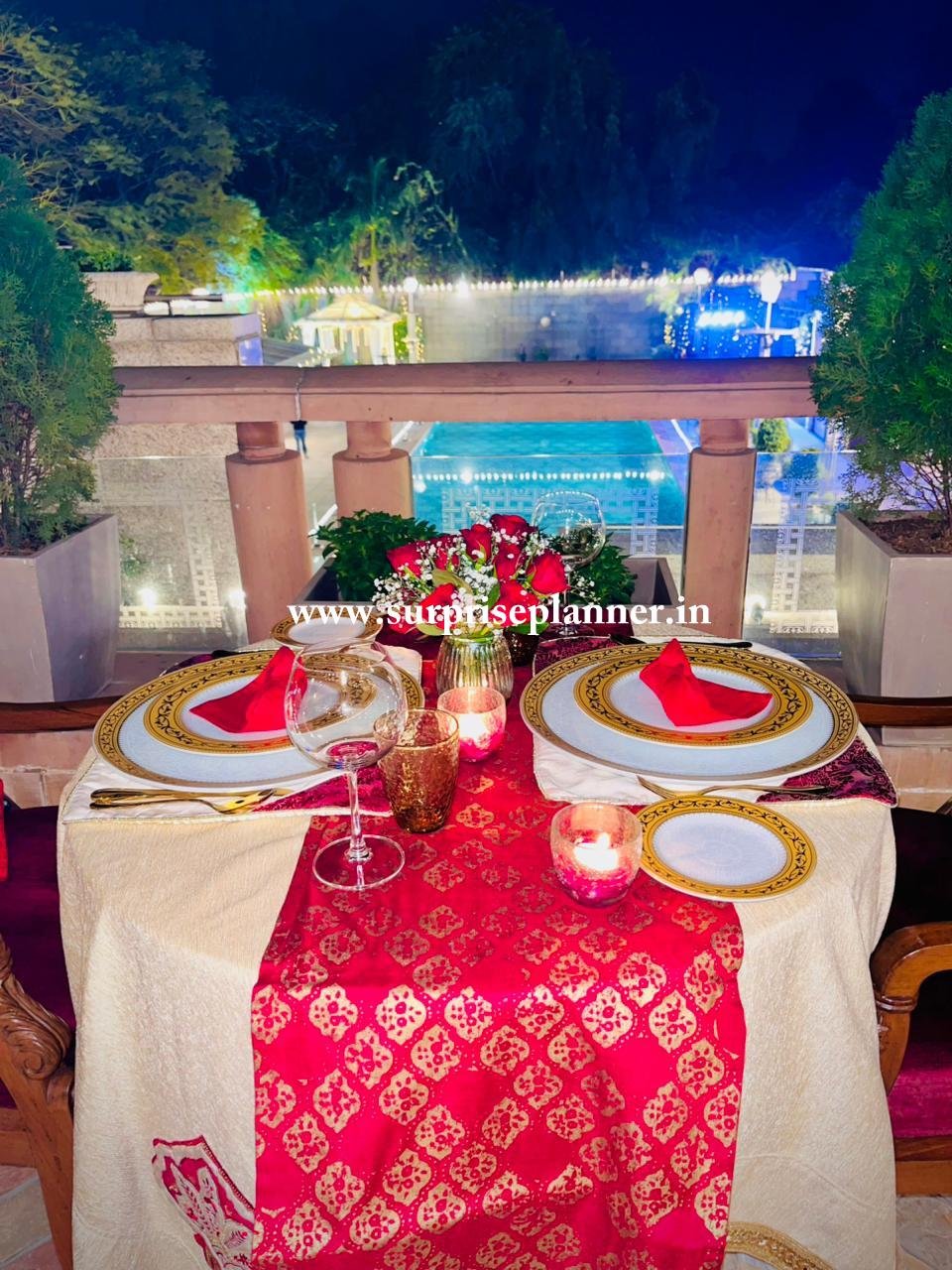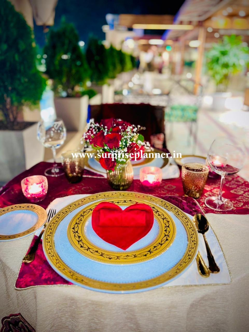 Soft glowing candles, fresh rose floral arrangements, and romantic table accents enhance the cozy ambiance, while the illuminated surroundings and night skyline add a magical charm. Perfect for Valentine’s Day celebrations, anniversaries, surprise dates, or even a romantic proposal, this setup transforms a simple dinner into a luxury love experience.