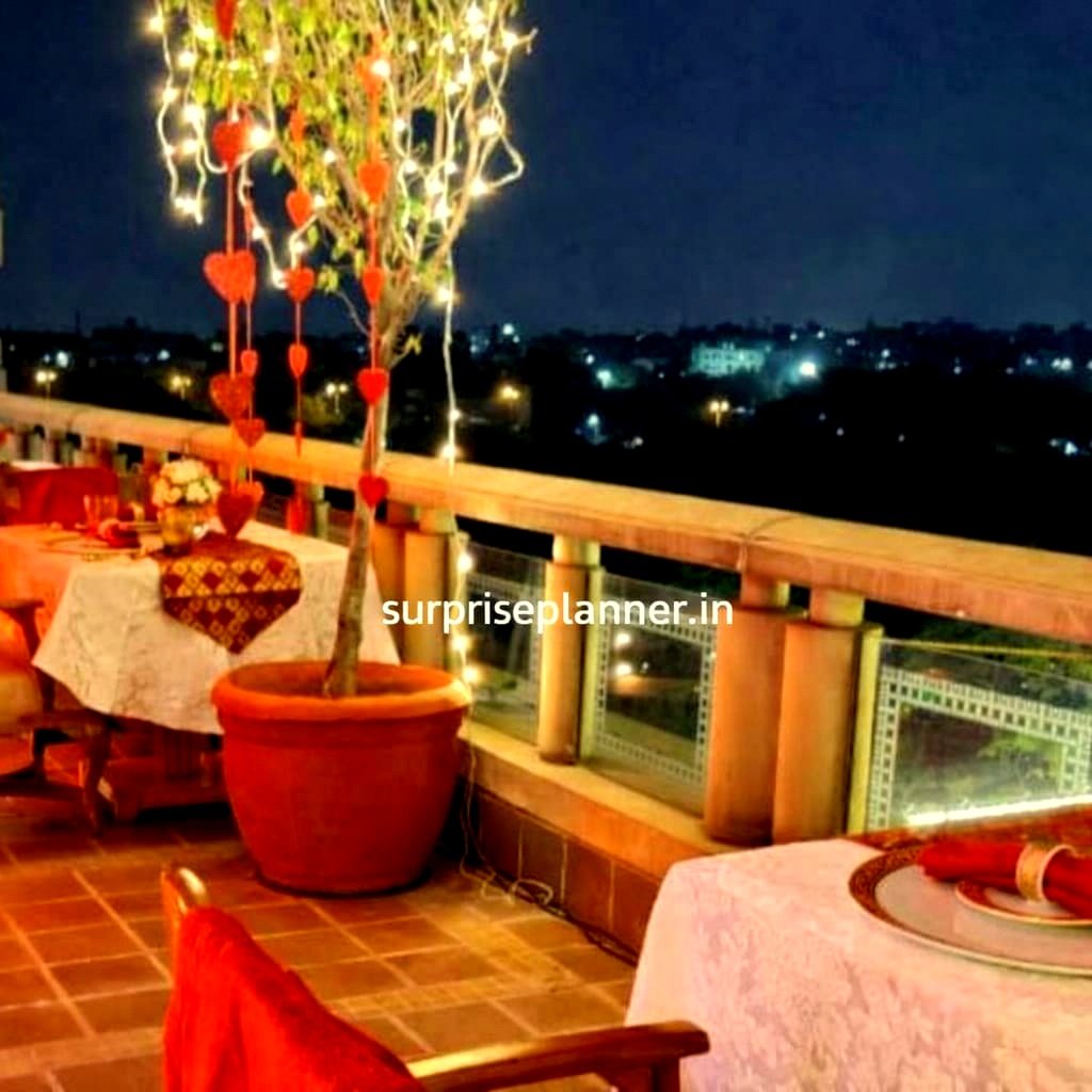 The fine dining table setup with premium crockery, wine glasses, and neatly folded napkins enhances the luxurious feel, while glowing candles add a magical charm to the evening. Whether you’re celebrating your first Valentine together, an anniversary, or planning a surprise romantic date, this setup offers the perfect balance of simplicity and sophistication.