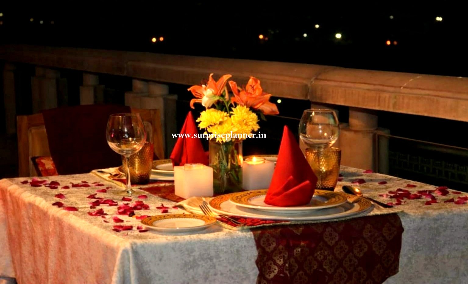 Celebrate love this Valentine’s Day with our Moonlit Romance Candlelight Dinner, an intimate private dining experience crafted for couples who cherish elegance, privacy, and heartfelt moments. Set against a serene nighttime backdrop, this beautifully decorated table features soft candlelight, rose petal detailing, elegant table linen, and a floral centerpiece that creates a warm and romantic ambiance.