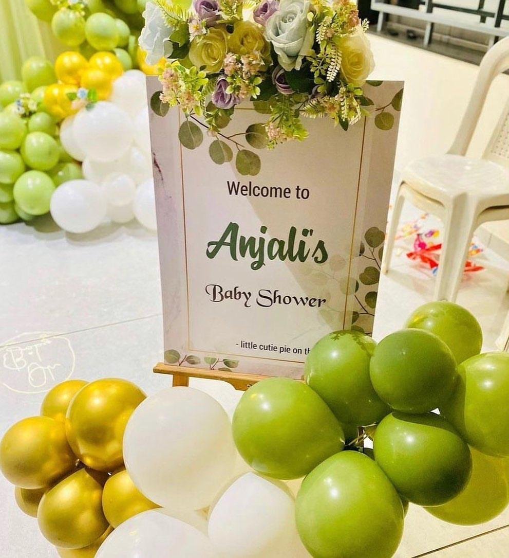 Your child's welcome celebration will be more fun with our balloon ring decorations for a baby shower. An elaborate circular balloon arch in a variety of striking colors, such as golden, white, and green, is the focal point of this design. It uses imaginative concepts, such as a welcome board and neon sign light with backdrop décor, to create a bright and lively atmosphere. This decoration, which has a message "the baby enters into your program," is ideal for serving as both the main attraction of the celebration and the background for pictures. Depending on what you desire, our talented groomers will create a special encounter. You may give your baby's celebration an extra special touch by using this adorable and straightforward Oh-Baby balloon ring decoration.