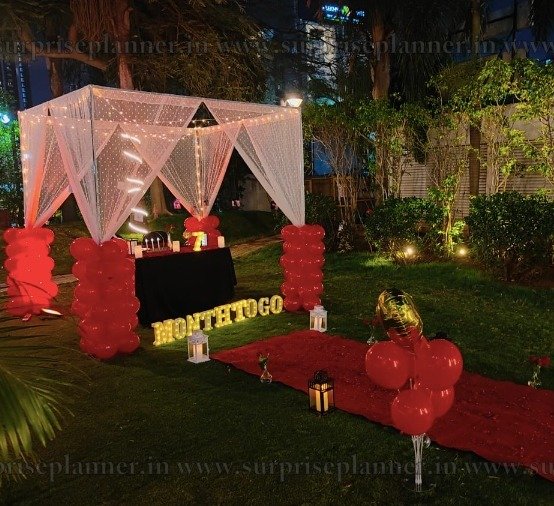 Enjoy a romantic evening at our Outdoor Cabana Candlelight Dinner in Hyderabad. This one-of-a-kind event takes place in a serene outdoor environment and includes a tastefully constructed cabana with soft lighting, candles, and fine décor. Enjoy exquisite dinner beneath the sky with a personalized menu. Whether you're celebrating a major event or simply enjoying a peaceful night out with your loved one, our dining experience provides the ideal balance of luxury and seclusion, as well as a relaxing ambiance and personalized service to ensure that you and your loved one have memories to remember.