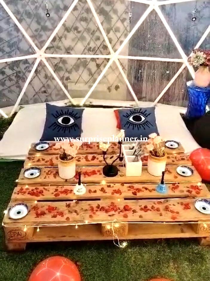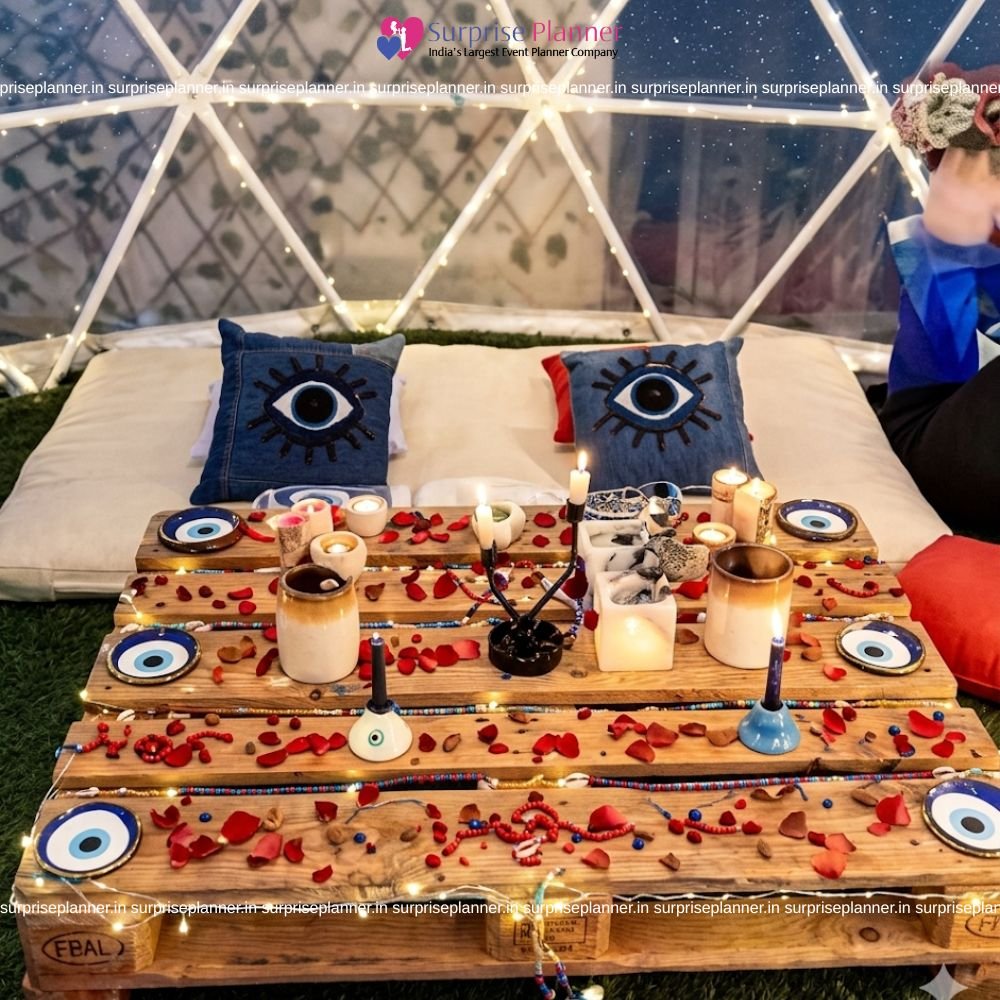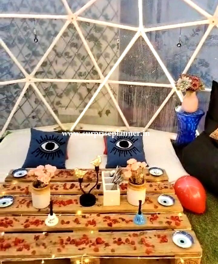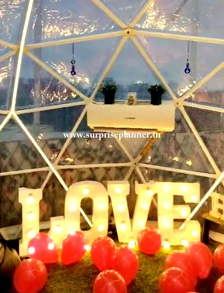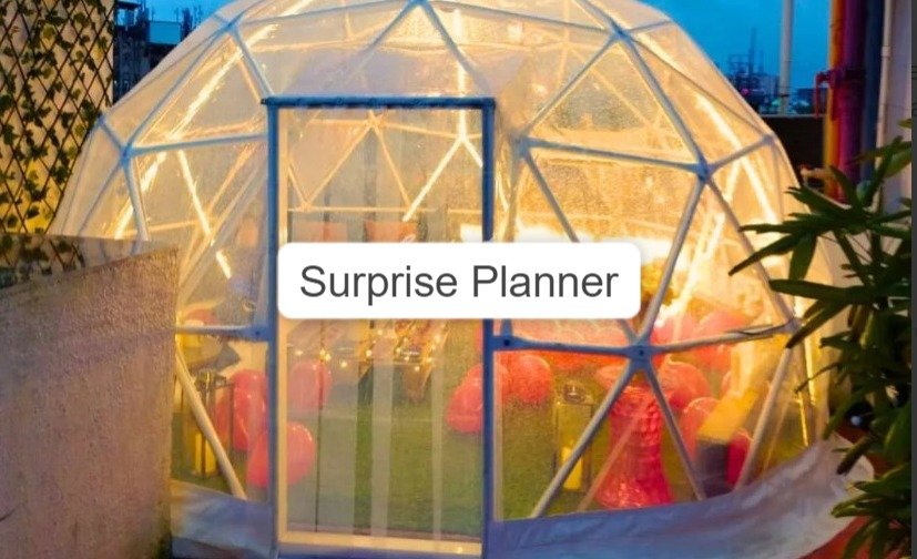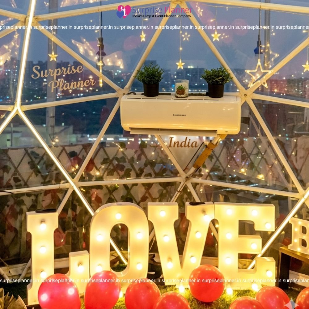 Picture yourself atop a rooftop, surrounded by the glittering lights of Mumbai's skyline, nestled within a personalized glass dome. Each detail meticulously crafted to perfection, from the balloons dancing in the breeze to the flickering candles casting a warm glow.
