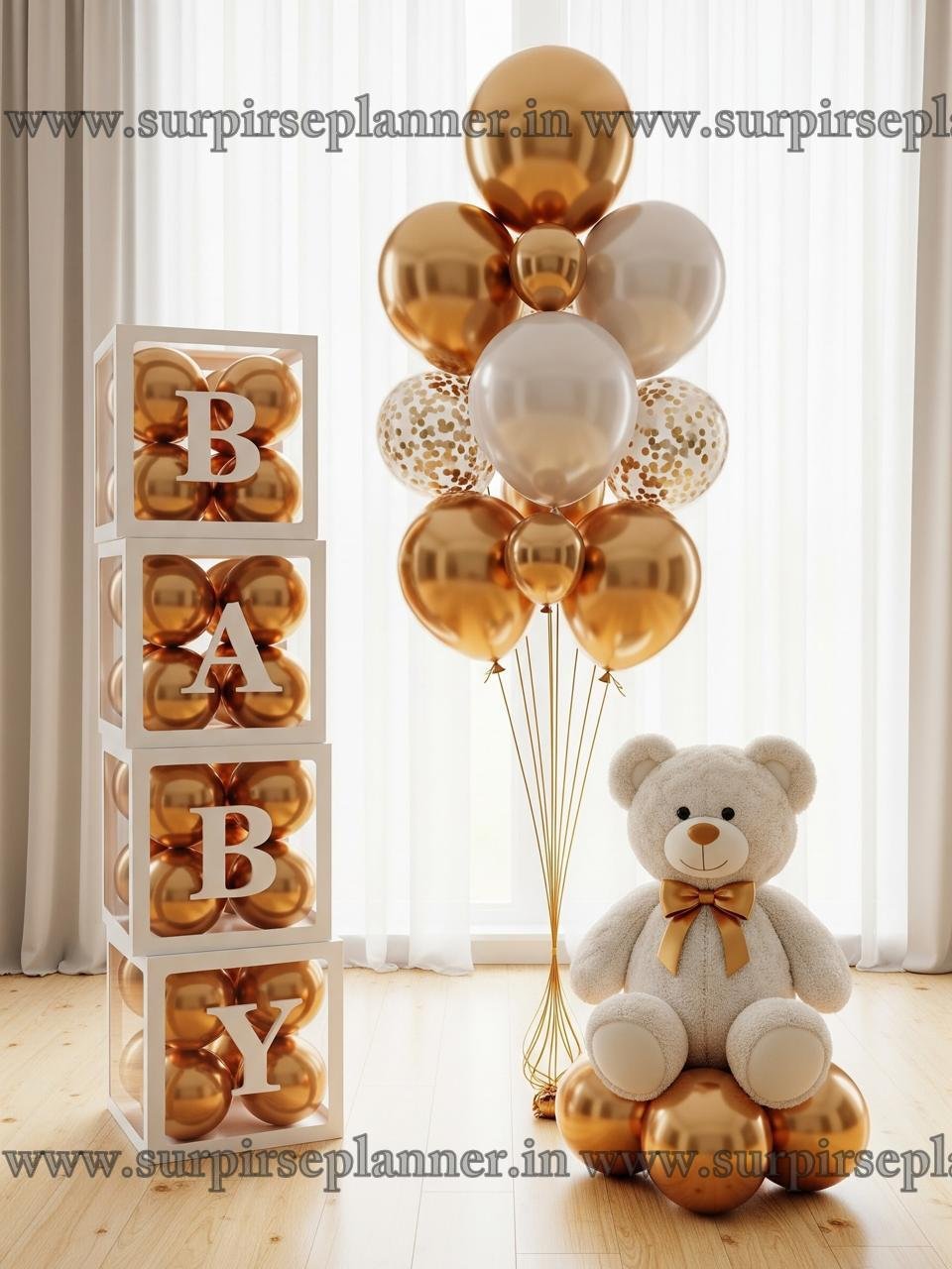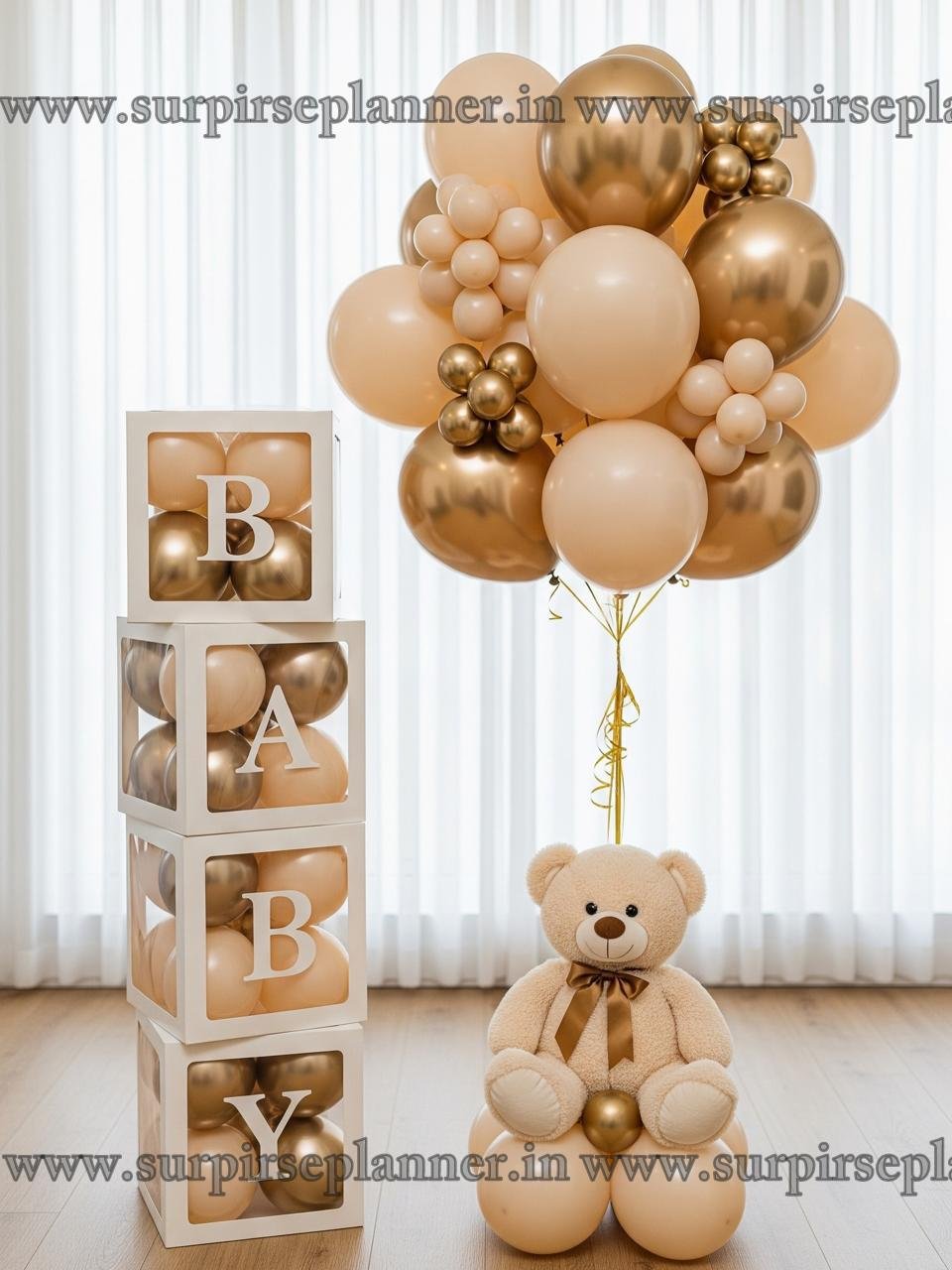 Welcome your little bundle of joy with this stunning Gold Luxury Baby Welcome Decoration, designed to make your home celebration warm, elegant, and picture-perfect. This setup features a premium combination of gold, white, and confetti balloons, a charming teddy bear, and stylish BABY letter boxes, creating the ideal backdrop for baby showers, welcome parties, gender reveals, and newborn celebrations.