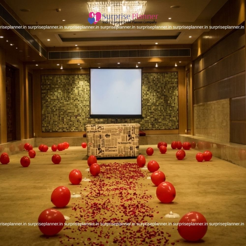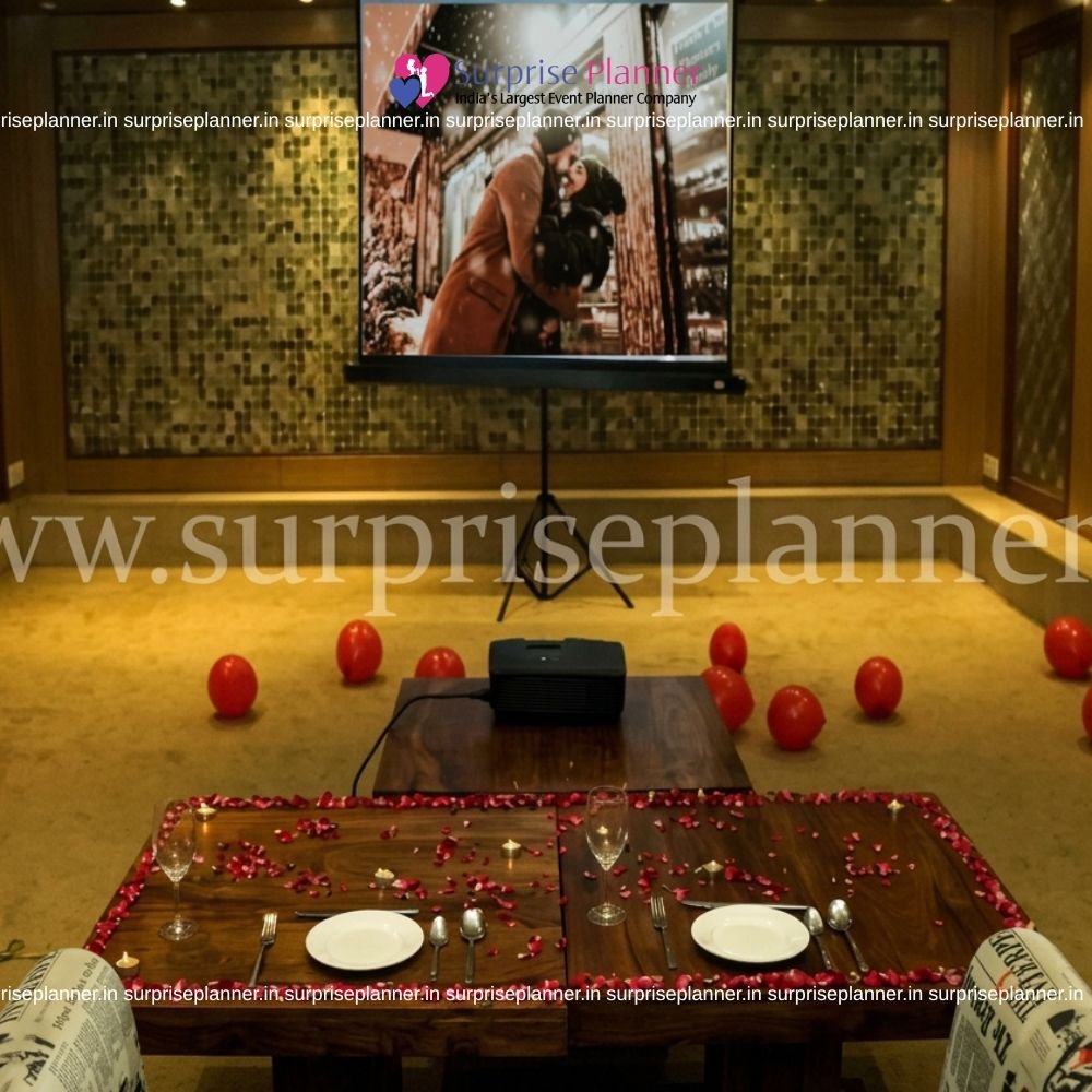 We decorate the room with red balloons. 200 balloons will be used in decoration. 100 will be on the floor, 50 will be on walls and 50 will be used on the ceiling. A seating arrangement sofa for two people will be there. There will be an entry gate. We decorate the floor through which you enter the destination using rose petals, candle lights, and lamps. It feels like you are walking in heaven holding your partner's hand. After entering in the destination place, a table fully decorated with rose petals over which a flower flask and two glasses of drinks will be there. Dim lights and candlelights will make the destination more romantic and lovable. You will really enjoy our surprise decoration with your partner because we always think of the best deal and satisfaction for each and every client. There will be an arrangement of snacks and dinner as you wish. We promise you that your beloved will really love your private movie surprise and we will give our best to make your surprise amazing. So, this time book private a movie surprise in Jaipur with Surprise Planner at your affordable price at your location. You just order & we will fulfill it.