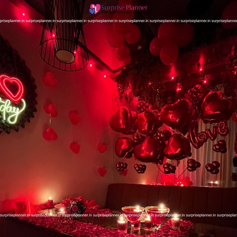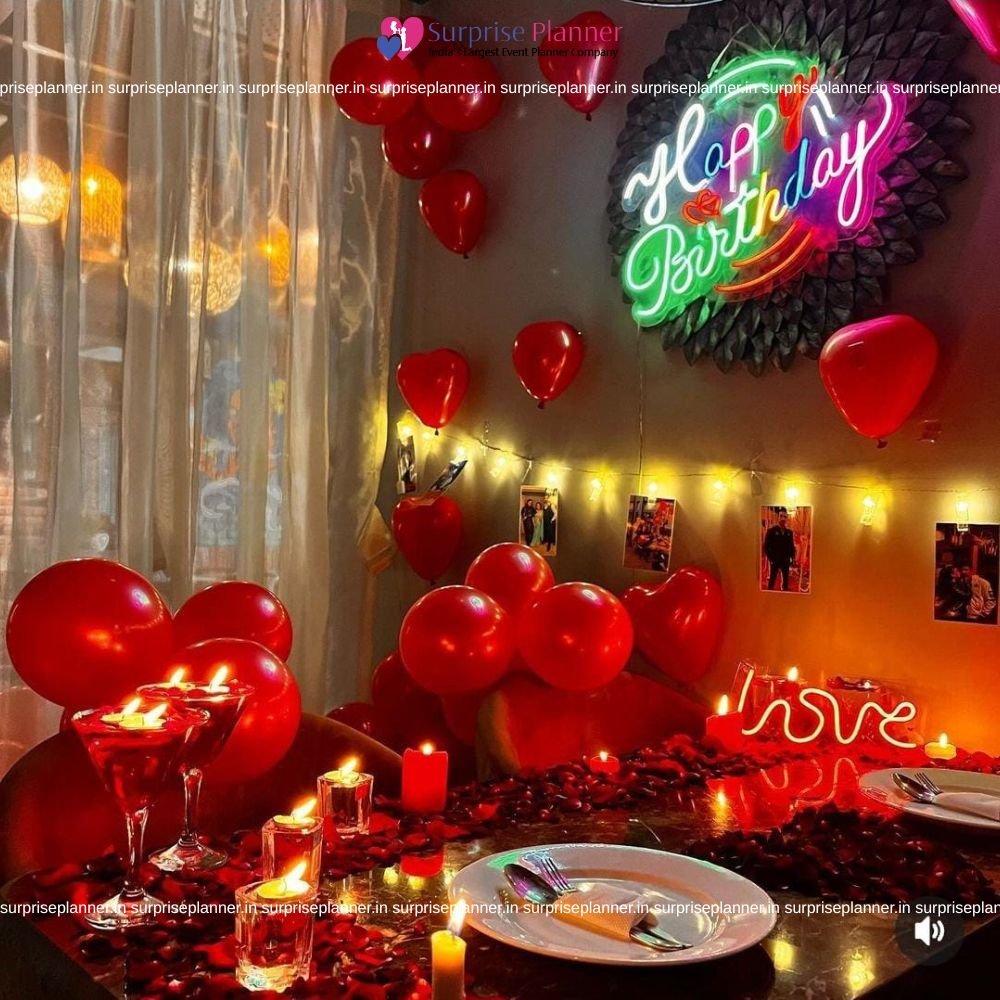 The setup features vibrant red balloons styled around the space, adding a festive yet romantic vibe. A stunning neon “Happy Birthday” sign becomes the focal point, glowing beautifully and enhancing the overall ambiance. Warm fairy lights delicately illuminate the area, while personalized photo strings add a heartfelt touch, showcasing your cherished memories together.